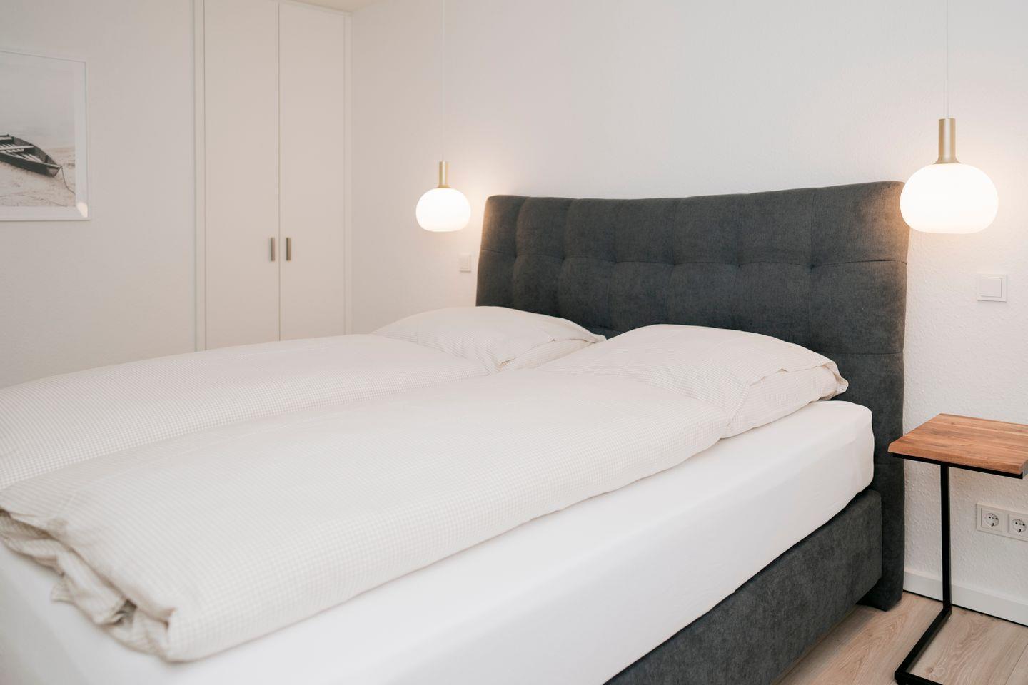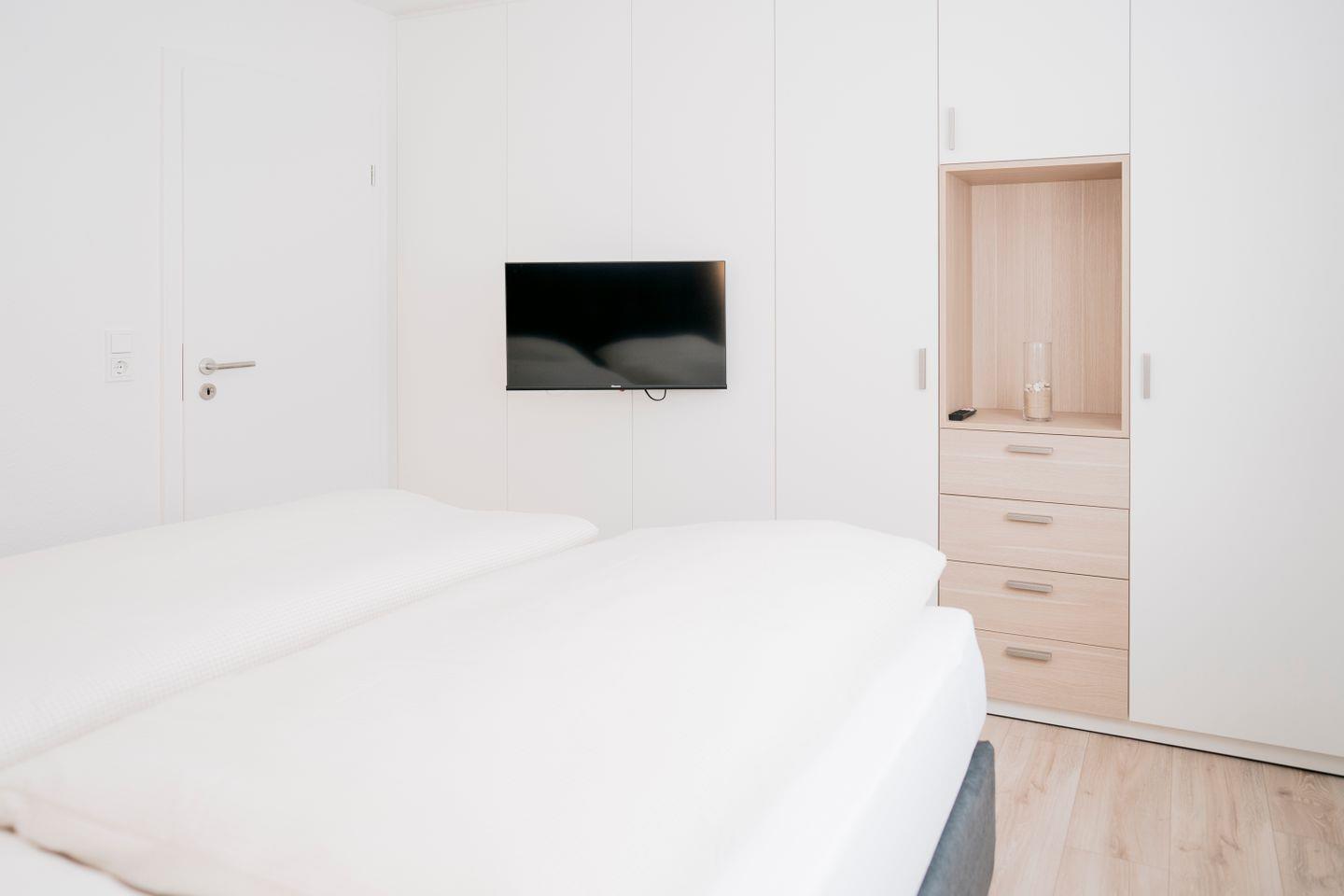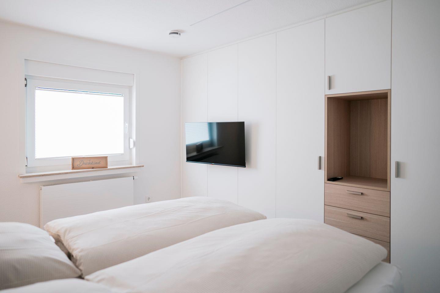 Dort finden Sie zwei gemütliche Schlafzimmer, die jeweils mit einem komfortablen Boxspringbett (180 x 200 cm), einem Kleiderschrank und einem eigenen Fernseher ausgestattet sind. Alle Räume lassen sich durch Rollläden – teilweise elektrisch – verdunkeln, was für angenehme Nächte sorgt. Das moderne Badezimmer mit Fenster verfügt über eine bodengleiche Dusche, WC, Waschtisch sowie eine eigene Waschmaschine.
