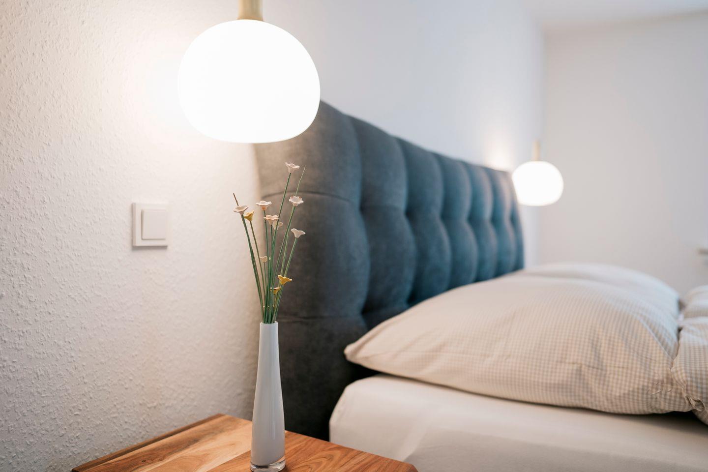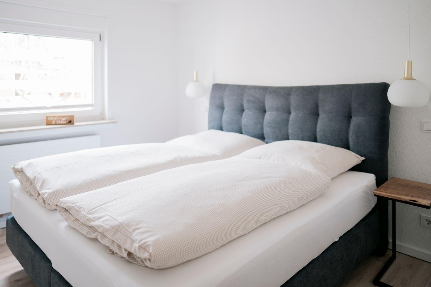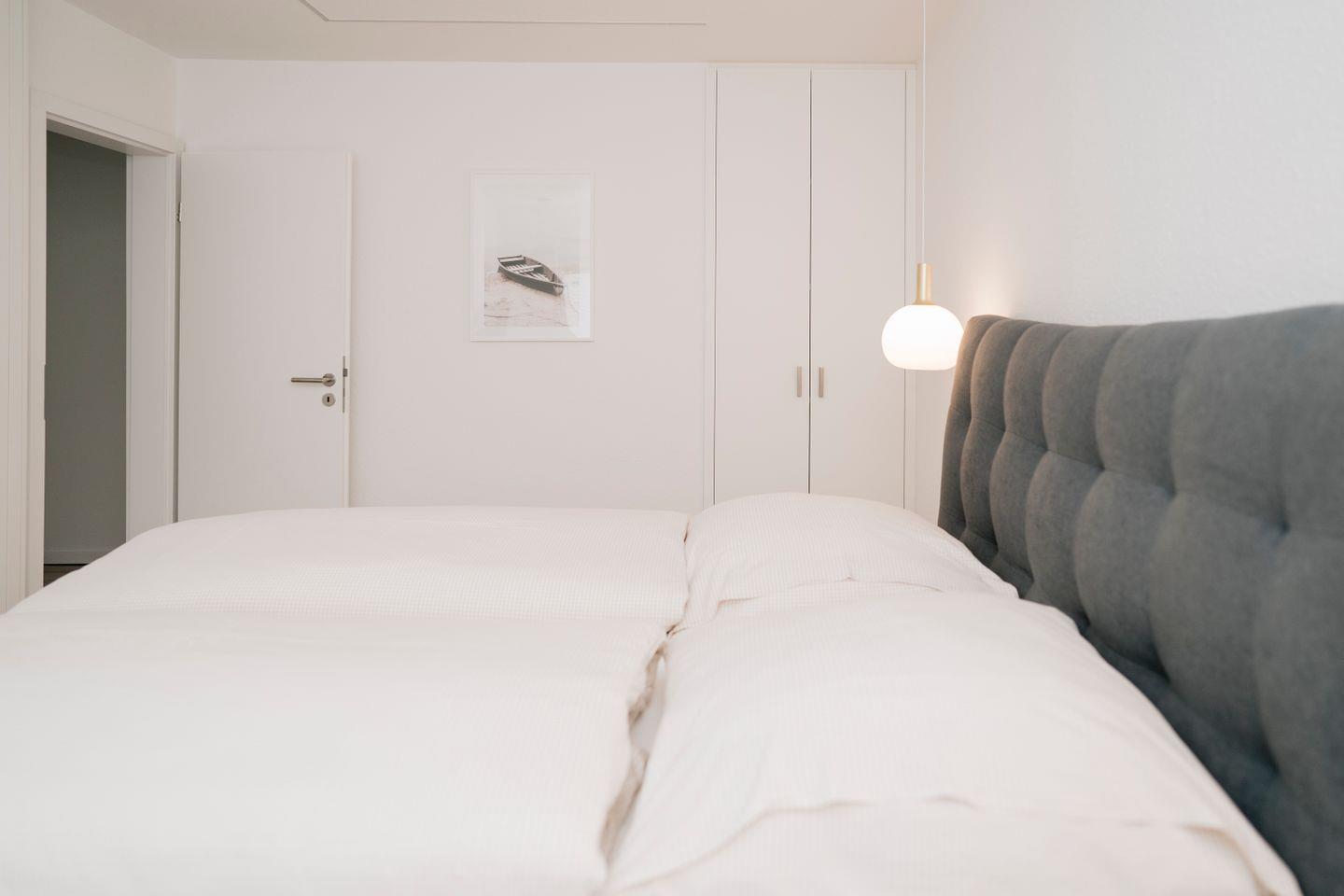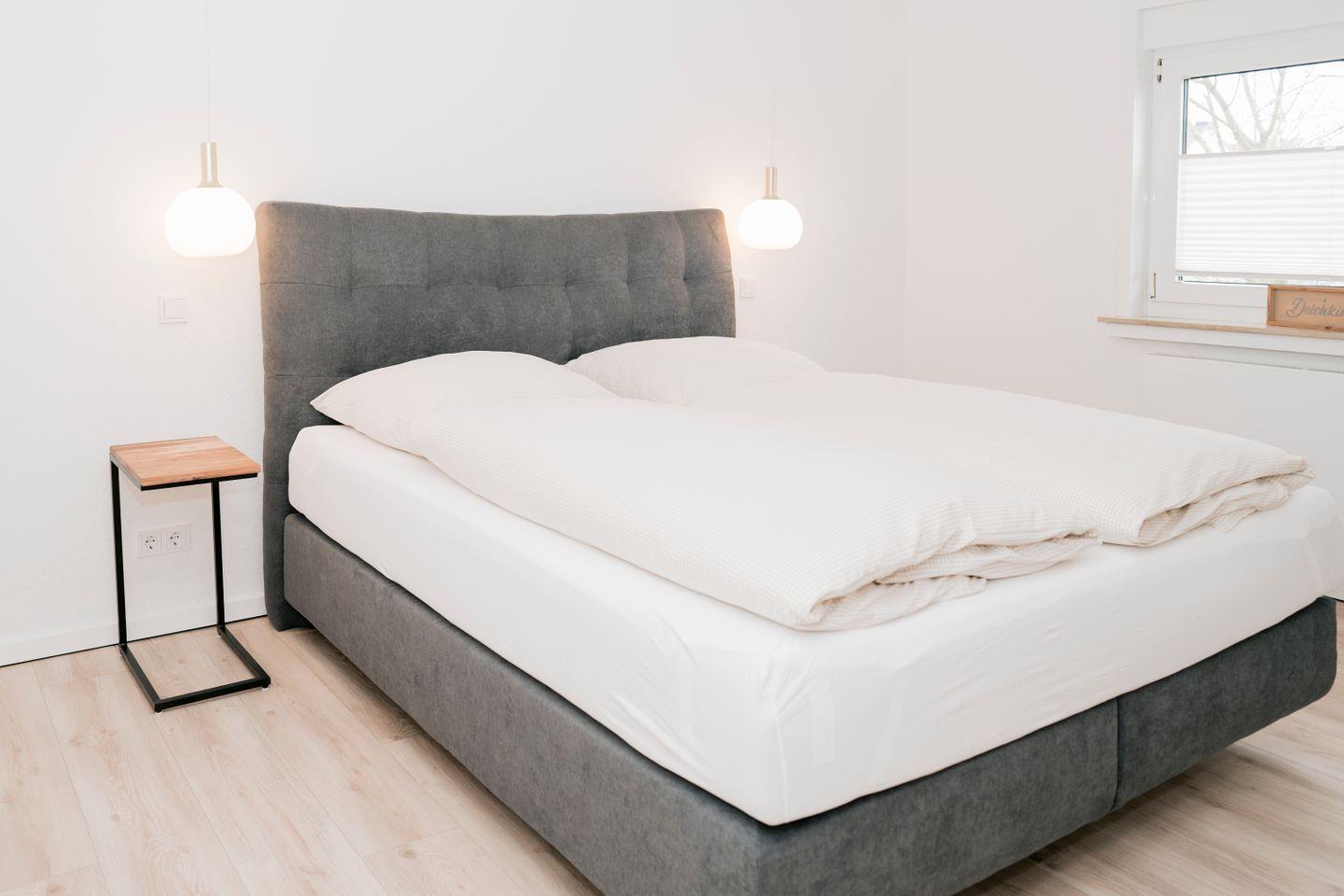 Dort finden Sie zwei gemütliche Schlafzimmer, die jeweils mit einem komfortablen Boxspringbett (180 x 200 cm), einem Kleiderschrank und einem eigenen Fernseher ausgestattet sind. Alle Räume lassen sich durch Rollläden – teilweise elektrisch – verdunkeln, was für angenehme Nächte sorgt. Das moderne Badezimmer mit Fenster verfügt über eine bodengleiche Dusche, WC, Waschtisch sowie eine eigene Waschmaschine.