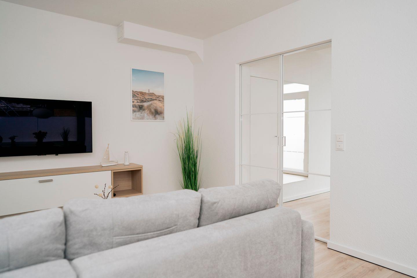 Der Wohnbereich ist mit einem modernen Ecksofa, Smart-TV und einer Leselampe ausgestattet – ideal für entspannte Abende oder gemütliche Lesestunden. Hier fühlt man sich schnell wie zuhause.