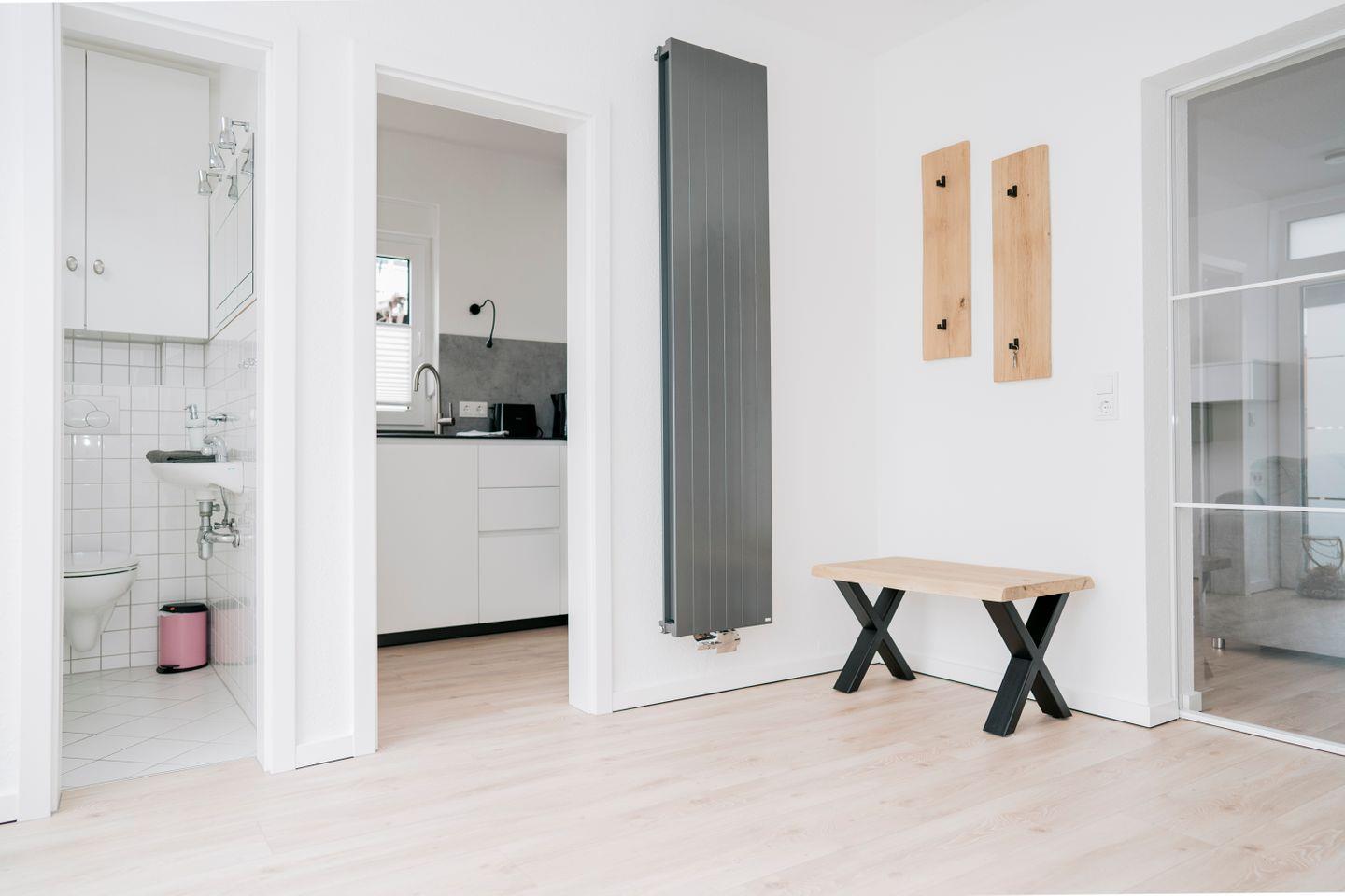 Im Eingangsbereich befindet sich eine großzügige Diele mit Garderobe und einem kleinen Abstellraum. Ein separates Gäste-WC im Erdgeschoss sorgt für zusätzlichen Komfort. Über eine helle Treppe gelangen Sie ins Obergeschoss.