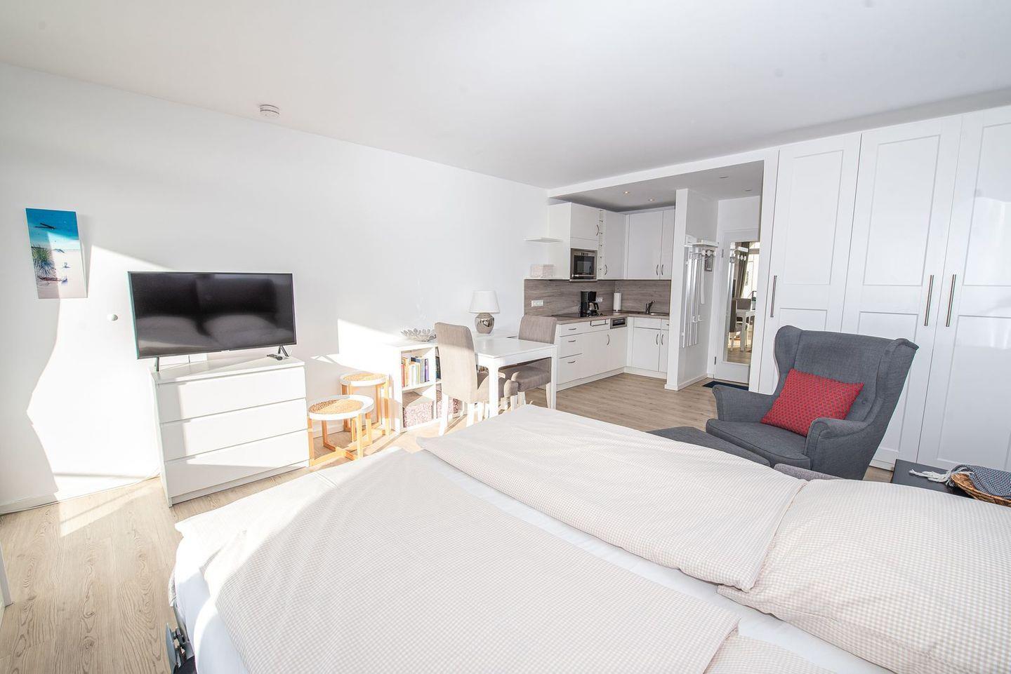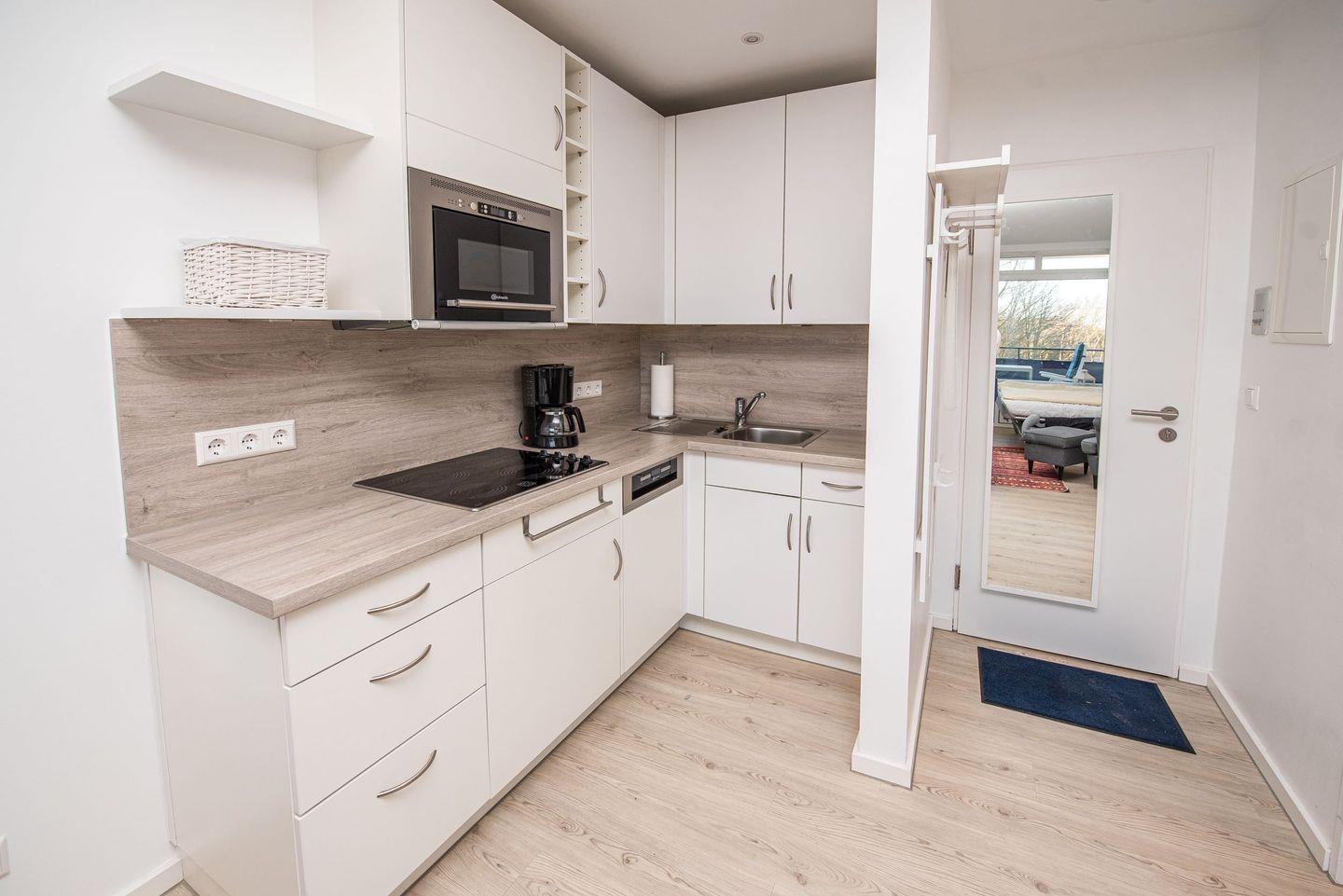 Direkt an den Wohnbereich schließt sich eine offene Küche an, die sich harmonisch in den Raum einfügt und zum Kochen einlädt. Ob ein schnelles Frühstück oder ein gemütliches Abendessen – hier ist alles Nötige vorhanden, um sich rundum wohlzufühlen.
