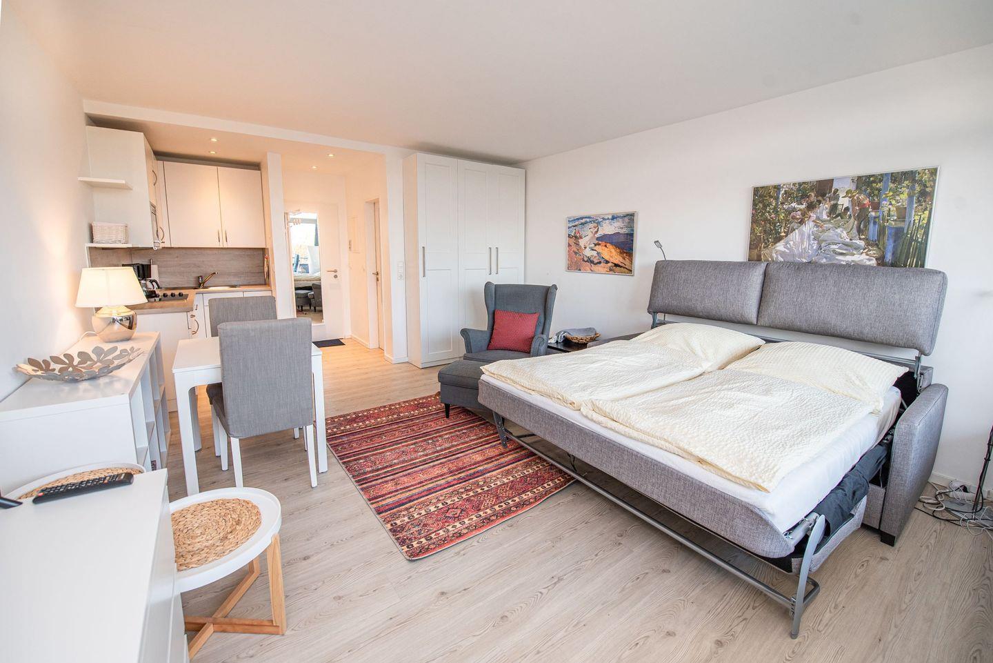 Diese modern eingerichtete und besonders helle Einzimmerwohnung liegt in der zweiten Etage eines gepflegten Hauses in ausgesprochen ruhiger Lage. Ideal für alle, die Entspannung und Erholung suchen. Die etwa 10 Quadratmeter große, nach Süden ausgerichtete Loggia ist ein echtes Highlight: Sie bietet einen weiten, unverbauten Blick auf den neu gestalteten Kurpark – perfekt, um die Sonne zu genießen oder einfach die Seele baumeln zu lassen.