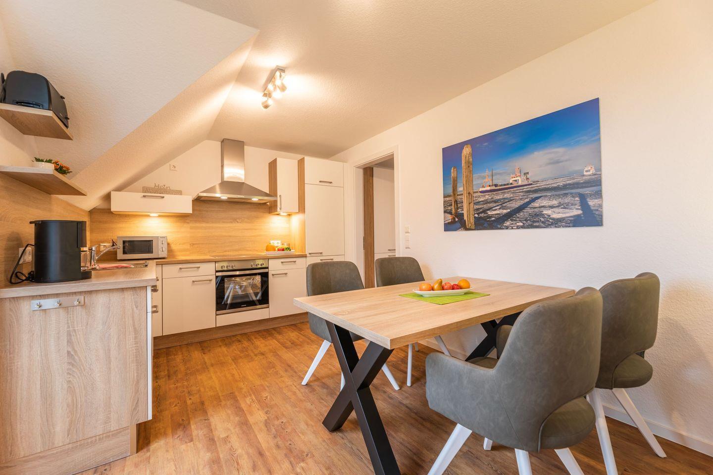 In der im Wohnbereich integrierte Küchenzeile finden Sie unter anderem alle modernen Küchengeräte wie Backofen mit Cerankochfeld, Kühlschrank mit Gefrierfach, Geschirrspülmaschine, Kaffeemaschine, Toaster, Wasserkocher usw.