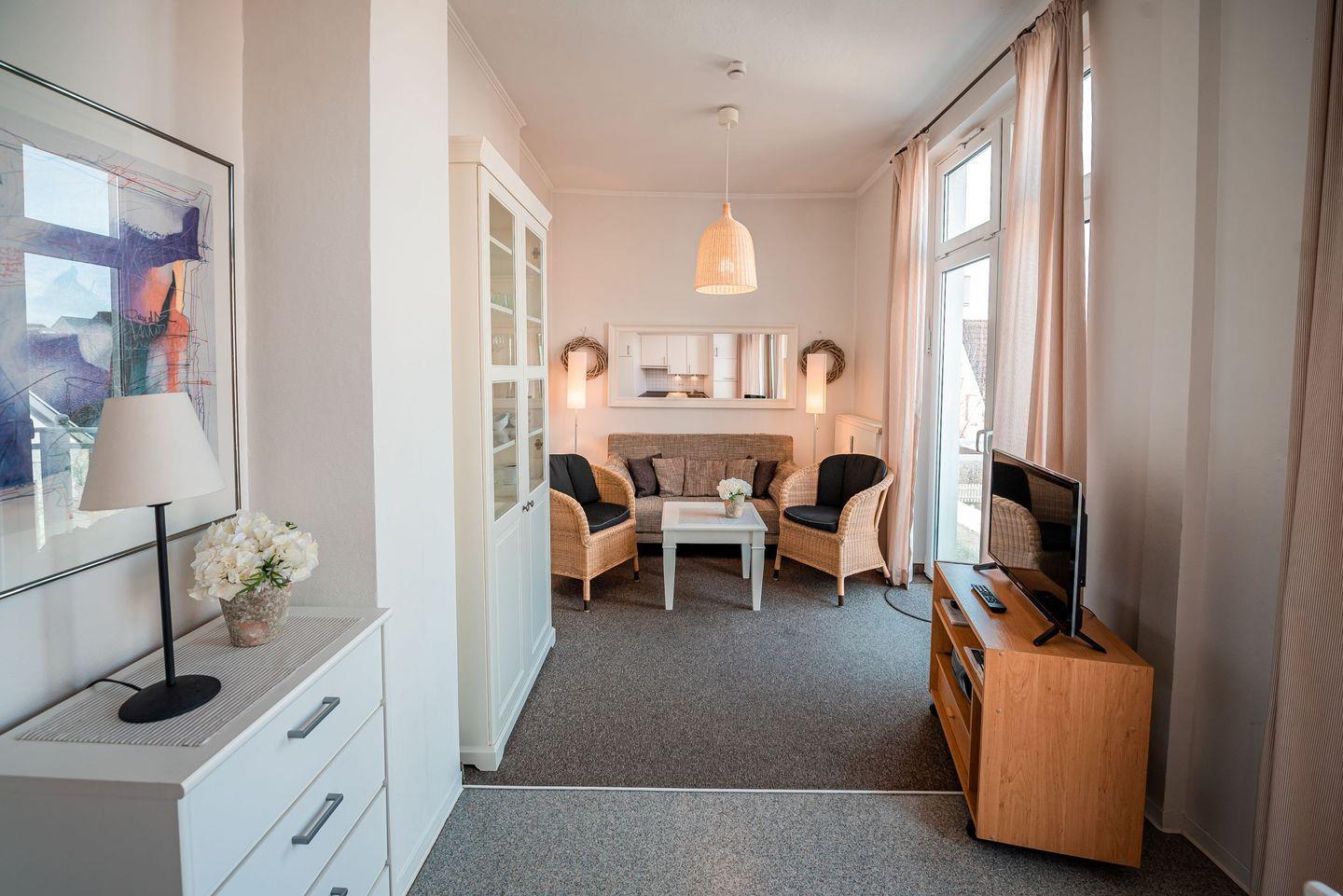 Der lichtdurchflutete Wohnbereich ist mit einem bequemen Schlafsofa, hellen Schrankmöbeln sowie einem Flachbild-TV und einer Stereoanlage ausgestattet – ideal für entspannte Abende nach einem Tag an der Nordsee.