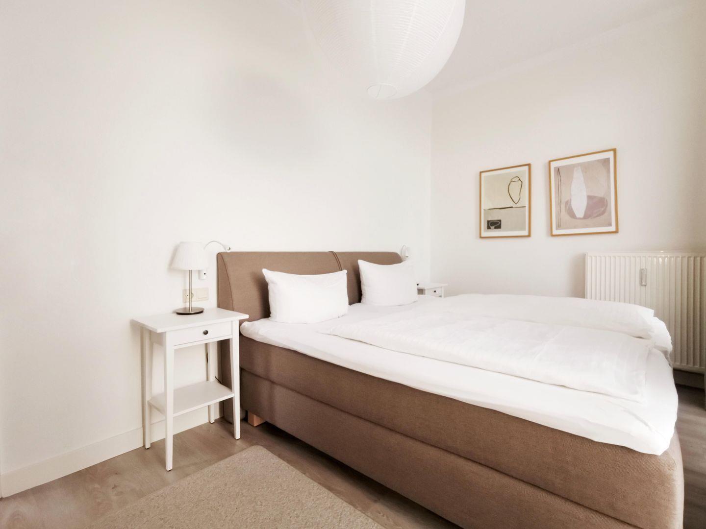 Das Schlafzimmer ist mit weißen Möbeln eingerichtet und verfügt über ein kuscheliges Doppelbett (1,80 x 2,00 m) – perfekt zum Ausschlafen und Wohlfühlen.