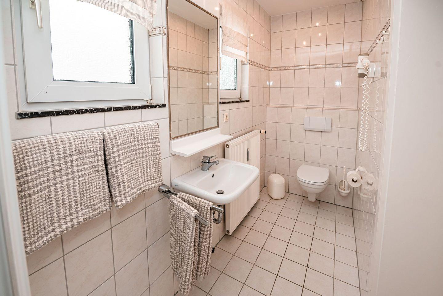Ein heller Flur mit Oberlicht, ein praktischer Abstellraum sowie das großzügige Badezimmer mit Fenster, Dusche und WC runden das Raumangebot dieser Ferienwohnung harmonisch ab.