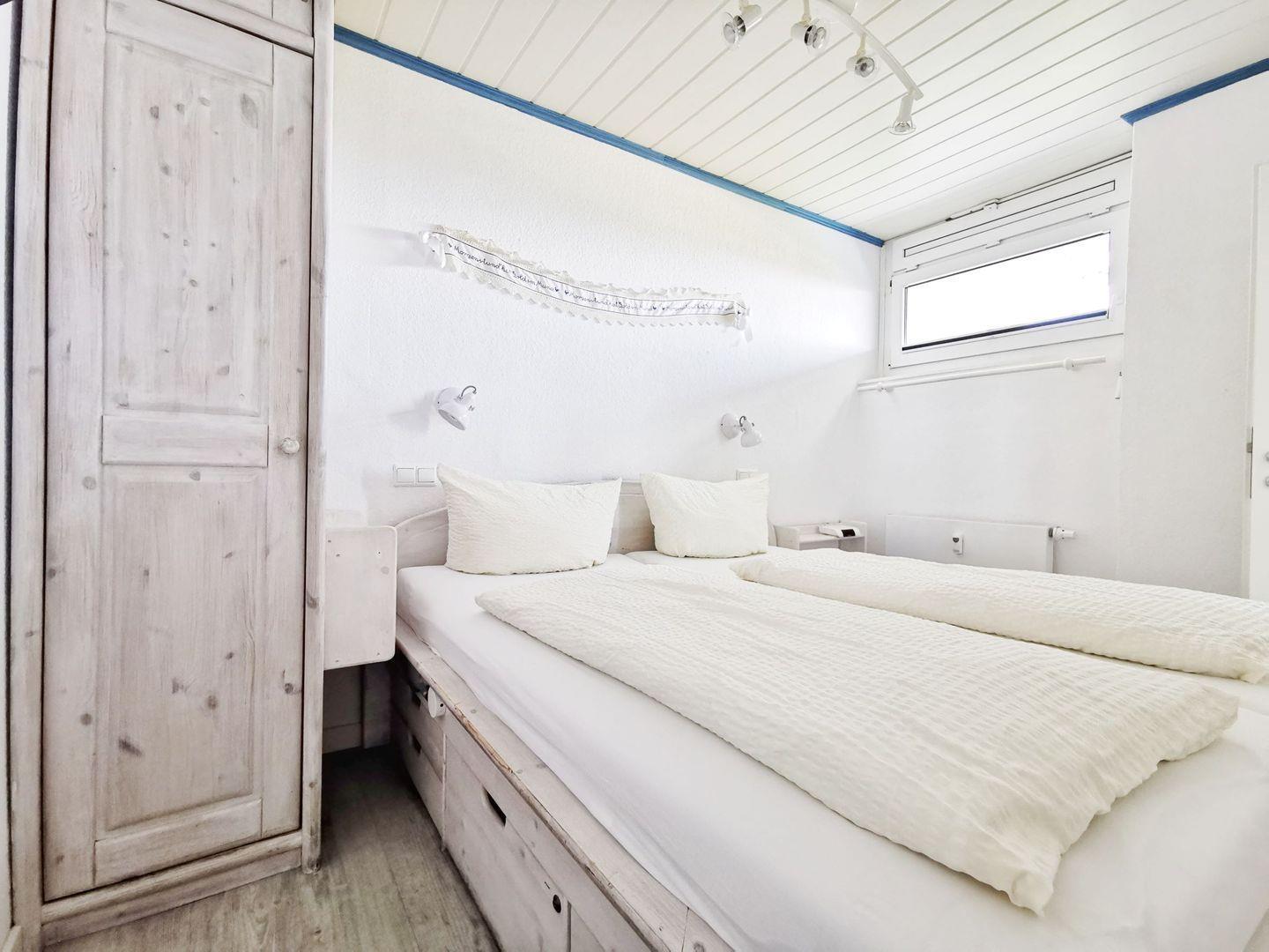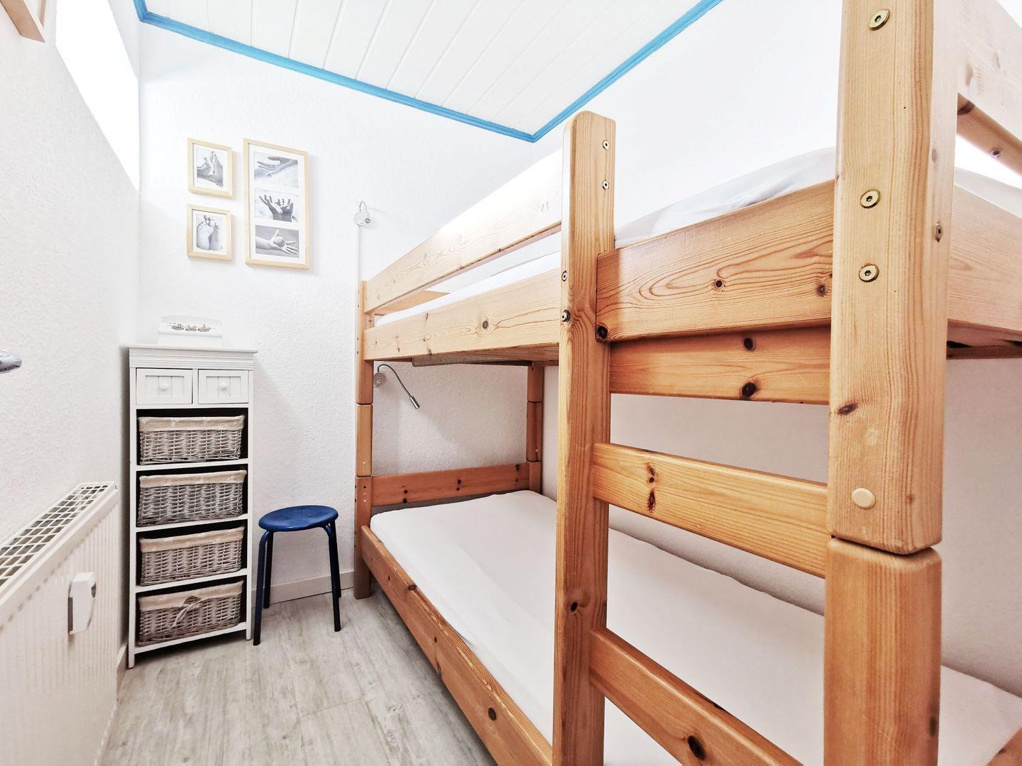Im Schlafzimmer erwartet Sie ein großes Kojen-Doppelbett (ca. 1,80 m x 2,00 m) mit hochwertigen Taschenfederkernauflagen und einem verstellbaren Lattenrost – für erholsamen und individuell anpassbaren Schlafkomfort. Das angrenzende Kinderzimmer ist funktional eingerichtet und mit einem Etagenbett (ca. 0,90 m x 2,00 m) ausgestattet.