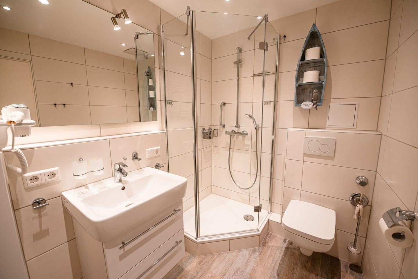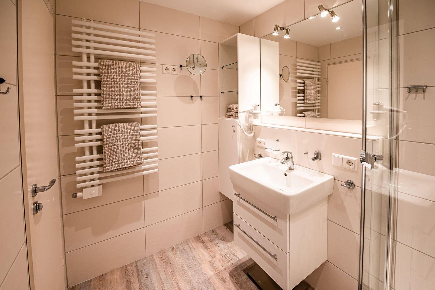 Das helle und freundlich gestaltete Badezimmer ist komplett gefliest und verfügt über WC, Dusche, einen Haartrockner sowie einen Schminkspiegel für zusätzlichen Komfort.