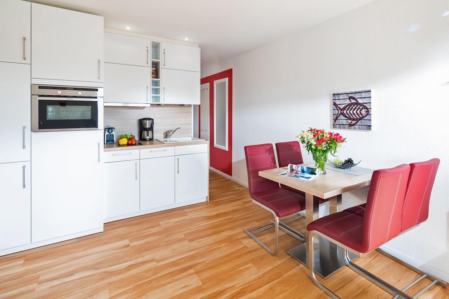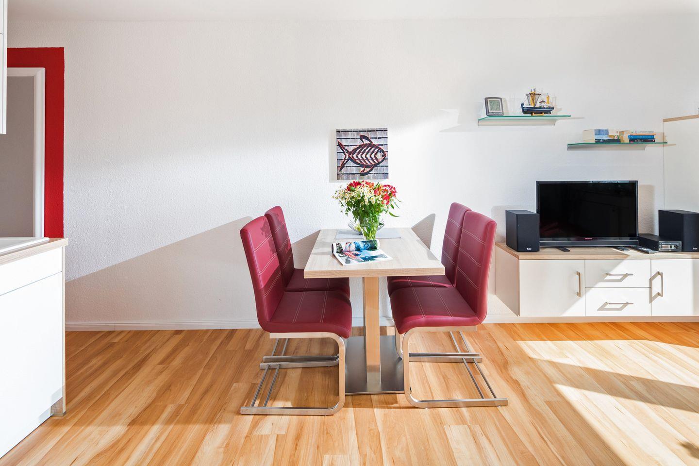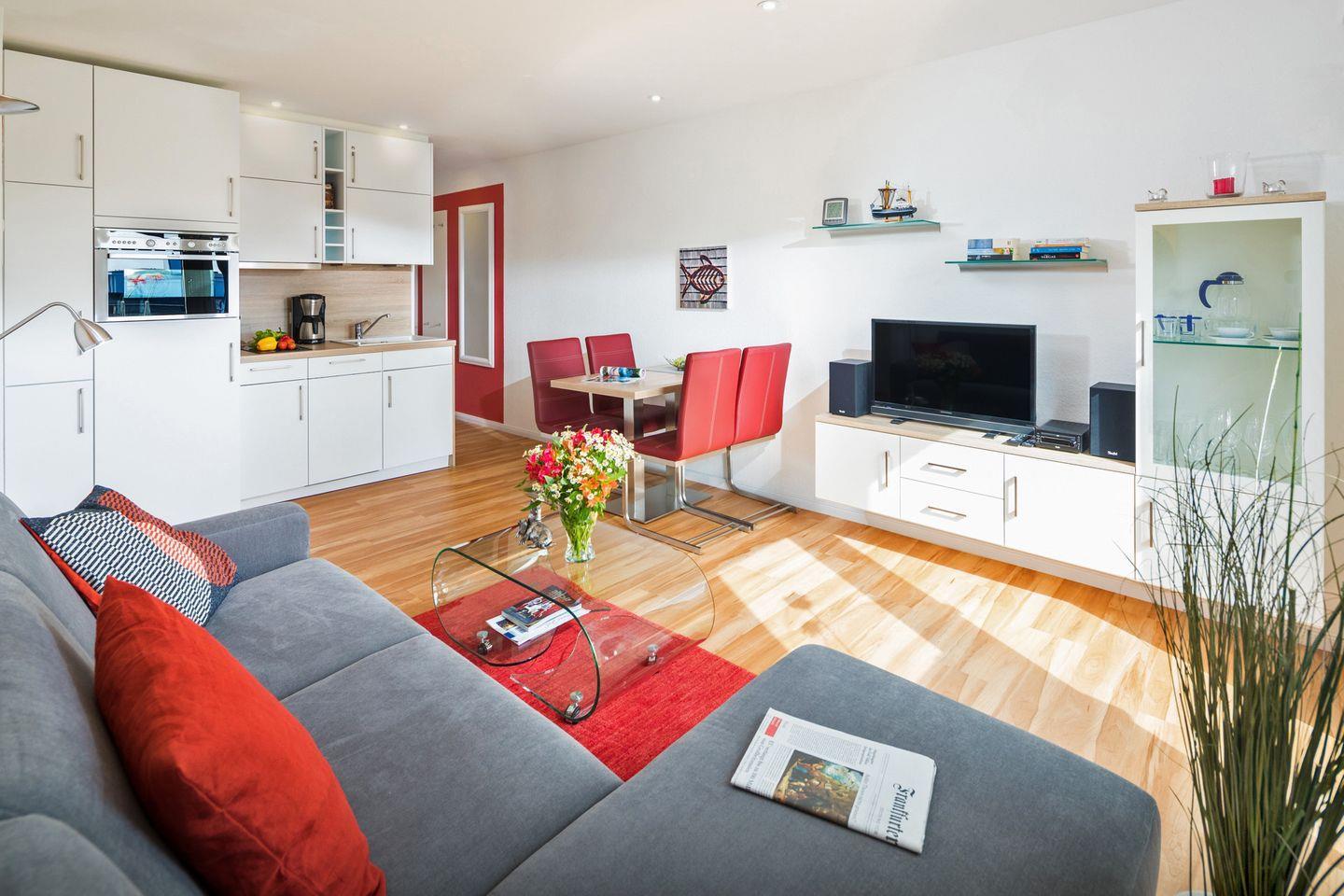 Der modern und geschmackvoll gestaltete Wohnraum lädt mit einem bequemen Ecksofa mit Schlaffunktion, einem Essplatz für 4 Personen, einem Flachbild-TV sowie einer Stereoanlage zu gemütlichen Stunden ein. Die in den Wohnbereich integrierte Küchenzeile ist vollständig ausgestattet und bietet ein 2-Platten-Cerankochfeld, eine Mikrowelle mit Grill- und Backfunktion sowie einen Geschirrspüler – ideal für die kleine Küche zwischendurch.