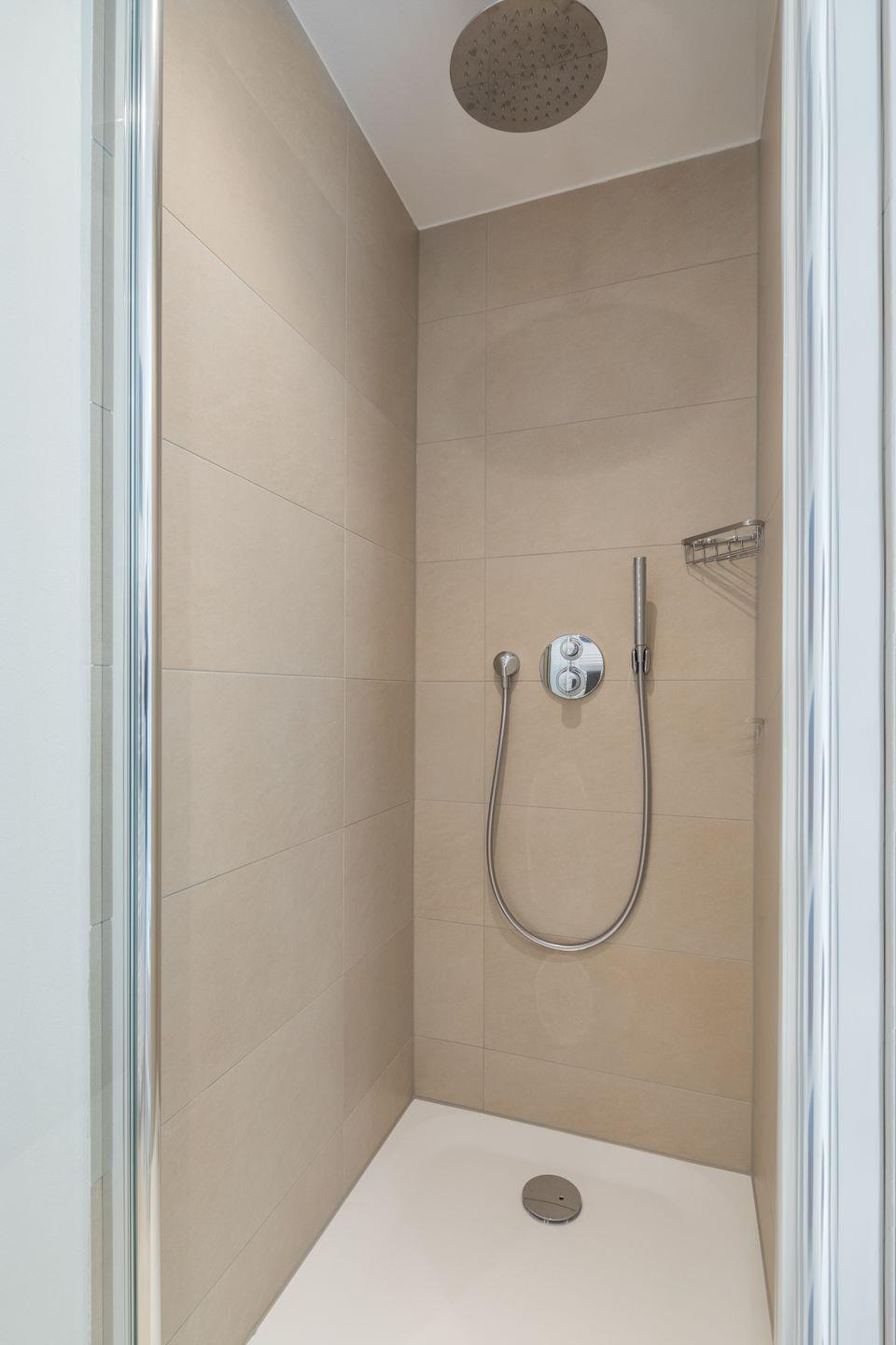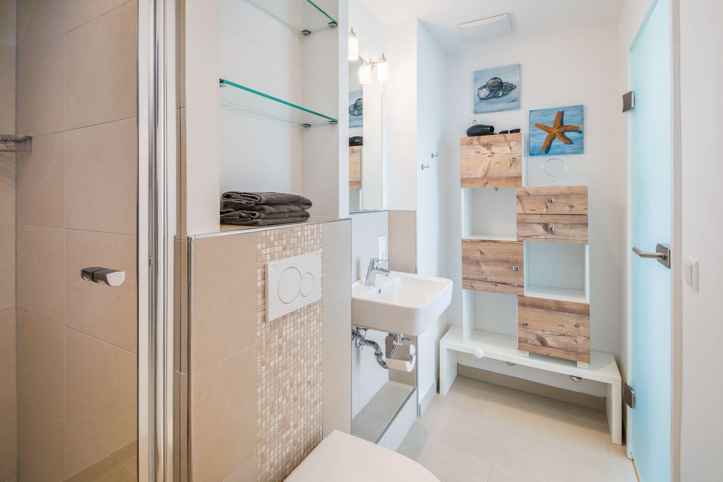 Das modern ausgestattete Badezimmer ist klein, aber durchdacht gestaltet. Es verfügt über eine Dusche mit Regenduschkopf und Handbrause, ein WC, einen Handtuchtrockner sowie einen Föhn.