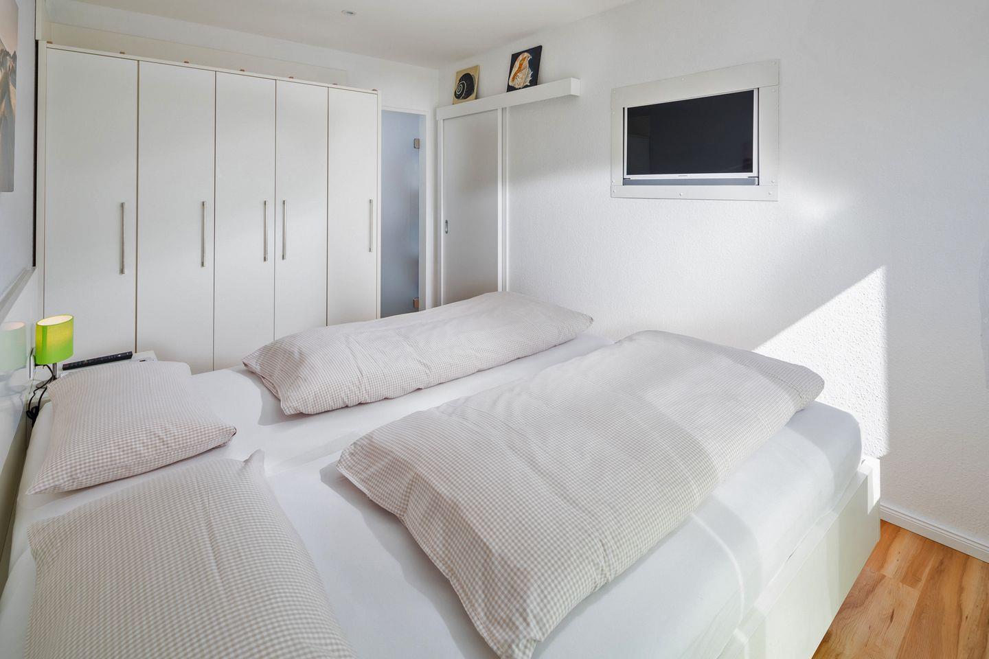 Das separate Schlafzimmer verfügt über ein komfortables Doppelbett, einen geräumigen Kleiderschrank und einen zweiten Flachbildfernseher. Der großzügige Balkon, der sowohl vom Wohn- als auch vom Schlafzimmer aus zugänglich ist, misst ca. 6,50 m in der Länge und 1,30 m in der Tiefe. Er ist nach Südwesten ausgerichtet und bietet bereits ab dem Vormittag Sonne – perfekt zum Frühstücken im Freien oder zum Entspannen mit einem guten Buch.