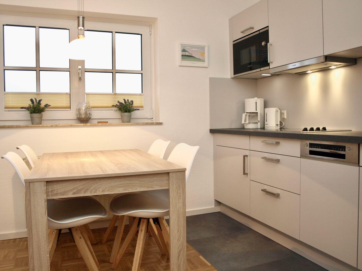 Der helle Wohnbereich ist mit einer großen Schlafcouch (mit Lattenrost) ausgestattet und lädt tagsüber zum Entspannen ein. Abends lässt er sich im Handumdrehen in einen komfortablen Schlafplatz verwandeln. Die integrierte Küchenzeile ist neu, hochwertig und komplett eingerichtet – mit Geschirrspüler, Glaskeramikkochfeld, Mikrowelle sowie Kaffeemaschine, Toaster und Wasserkocher. Ein Essplatz für vier Personen sorgt für eine angenehme Trennung von Wohn- und Kochbereich.