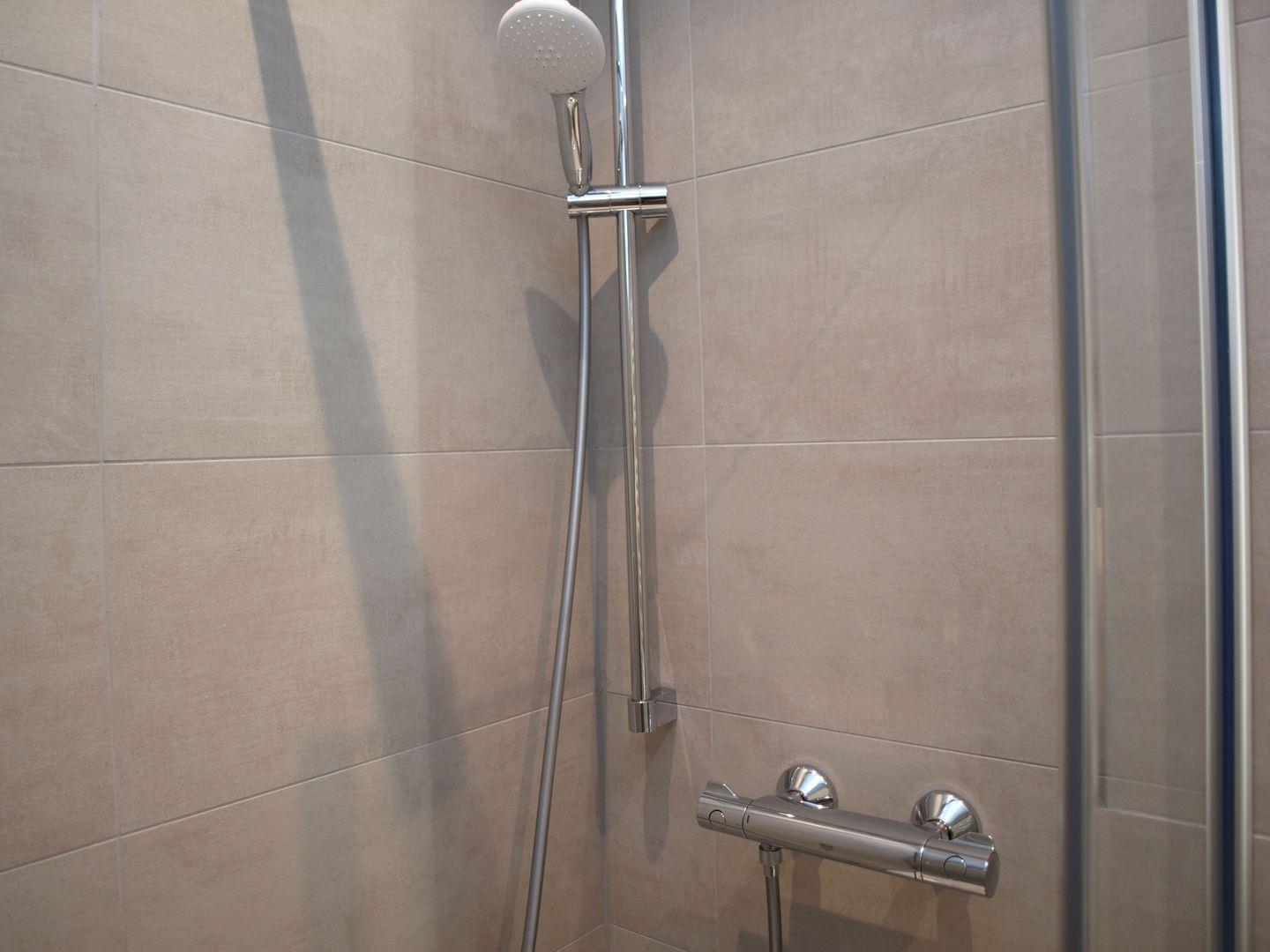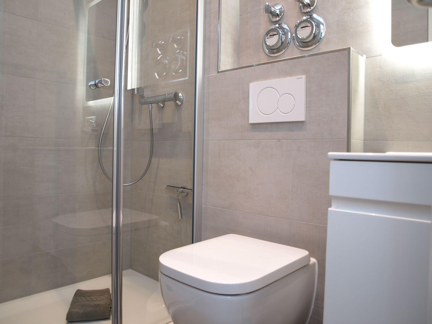 Das moderne Badezimmer überzeugt mit hellen Naturtönen und ist mit Dusche, WC und einer großen, ebenerdigen Dusche ausgestattet – perfekt für ein Plus an Komfort.