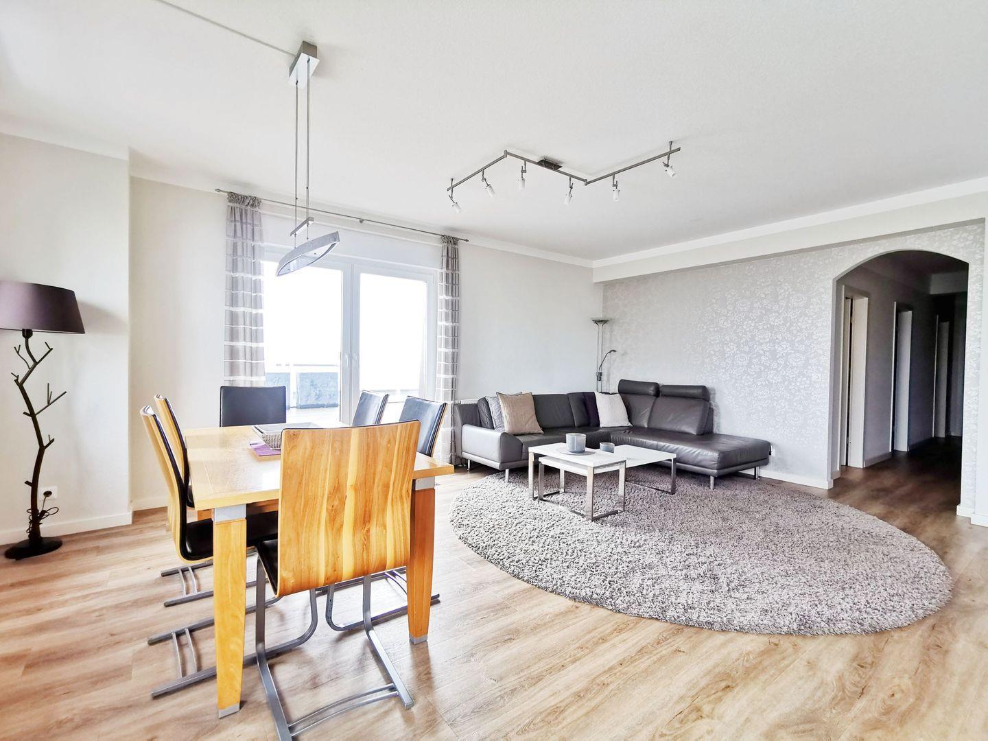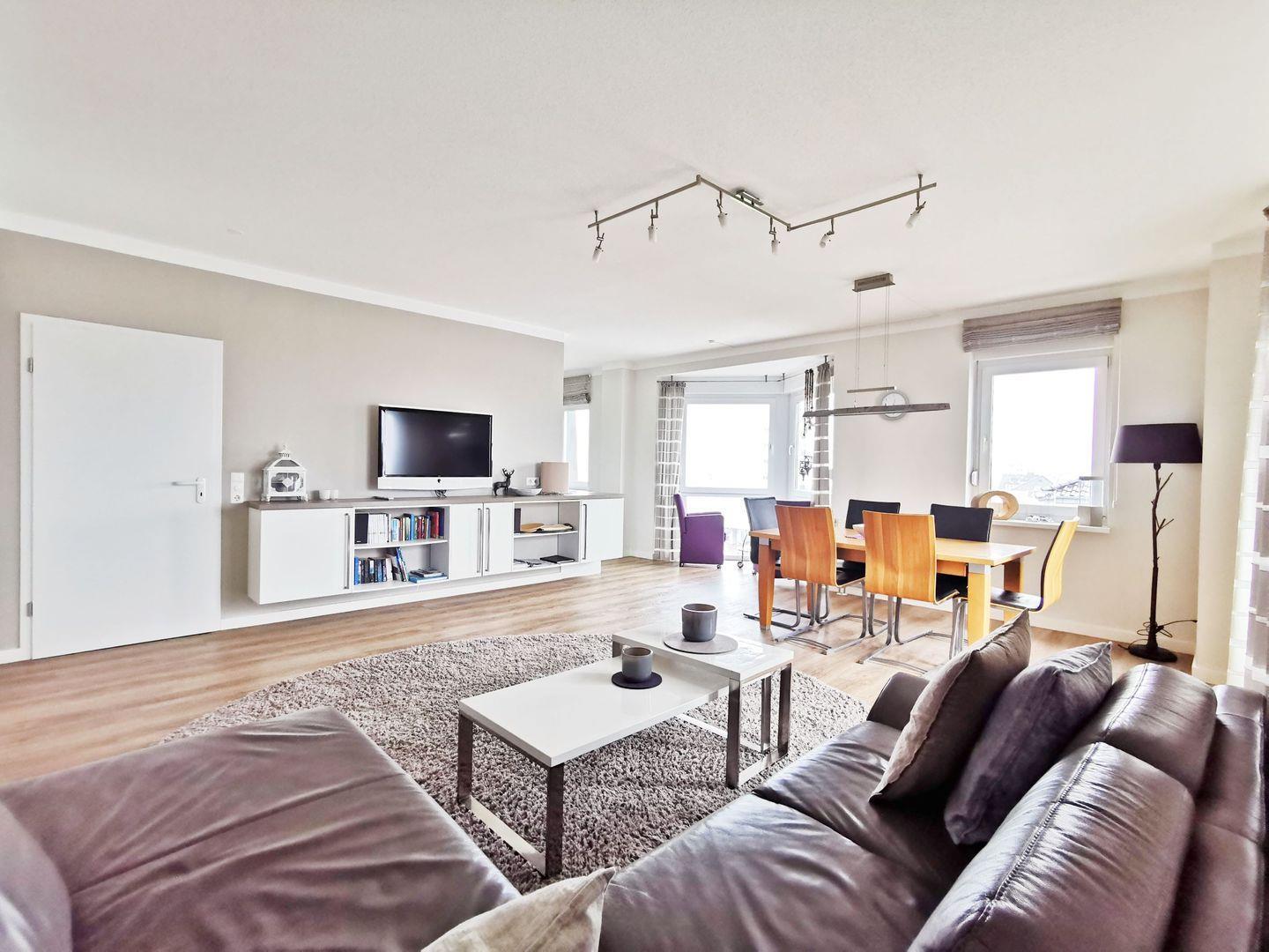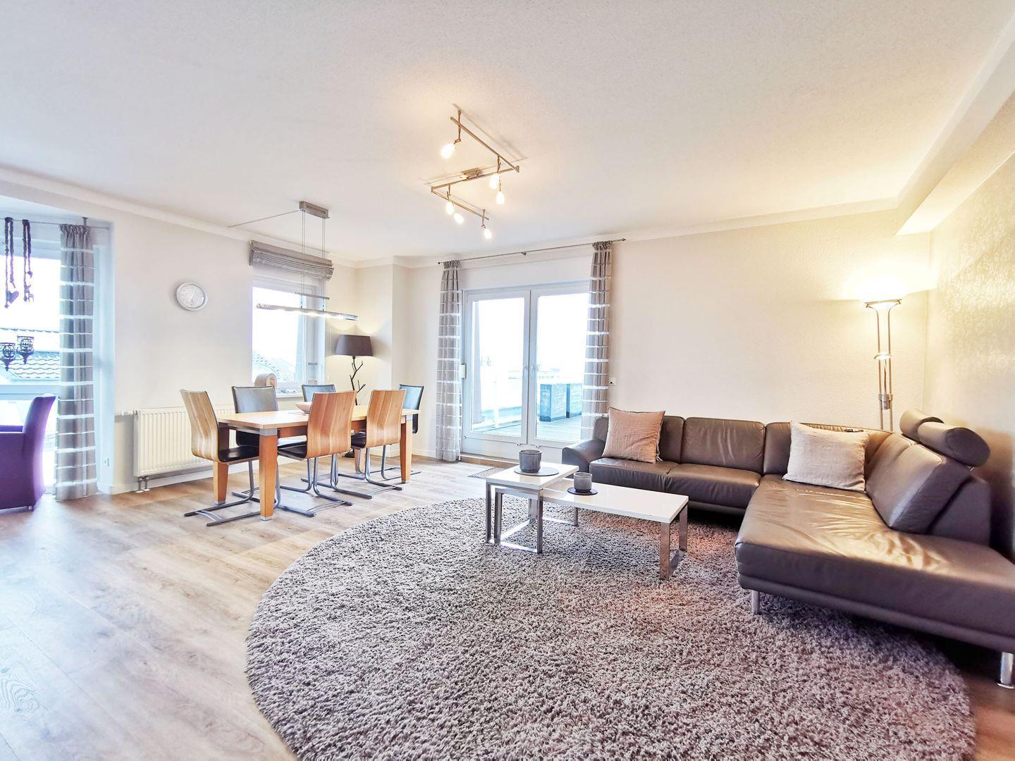 Der helle und freundliche Wohnbereich besticht durch eine großzügige Sofalandschaft sowie einen separaten Essbereich, die zusammen eine einladende und zugleich moderne Atmosphäre schaffen. Für Unterhaltung sorgen Kabel-TV mit großem Flachbildschirm, ein DVD-Player sowie eine Stereoanlage.