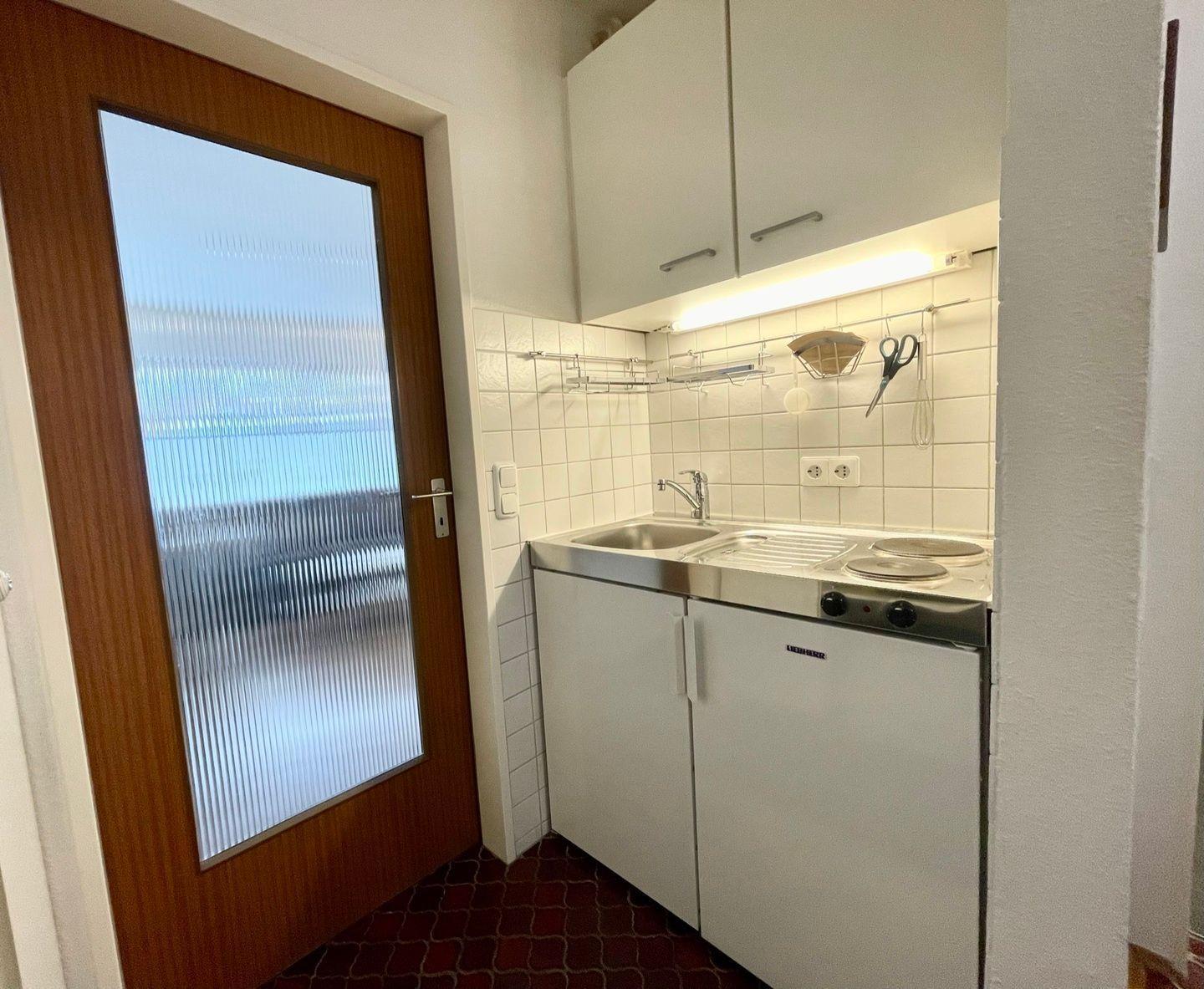 Die in den Flur integrierte Küchenzeile ist mit einen 2 Platten Kocher, Kühlschrank, Kaffeemaschine Toaster etc. ausgestattet.