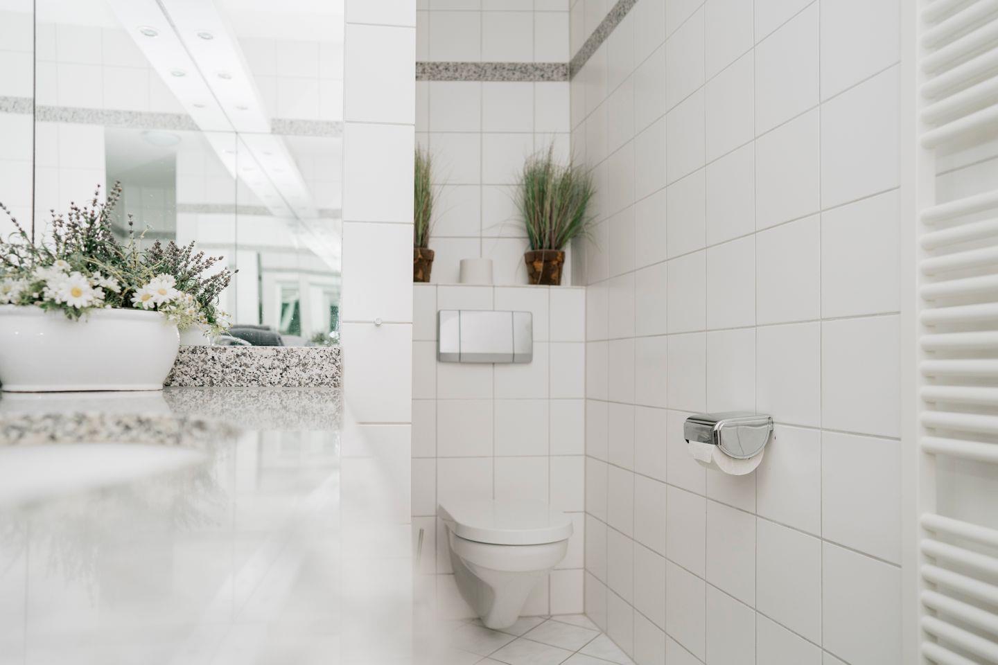 Das Badezimmer ist modern eingerichtet und verfügt über einen großen Waschtisch mit Ablage, Dusche, WC, Haartrockner und Handtuchtrockner.