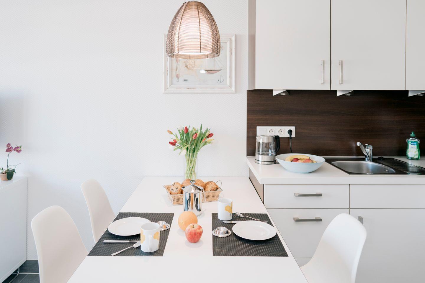 Die komfortable 2-Raum-Wohnung verfügt über eine in den Wohnraum integrierte, komplett eingerichtete Küchenzeile mit Geschirrspüler, Kühlschrank, Mikrowelle und Cerankochfeld.