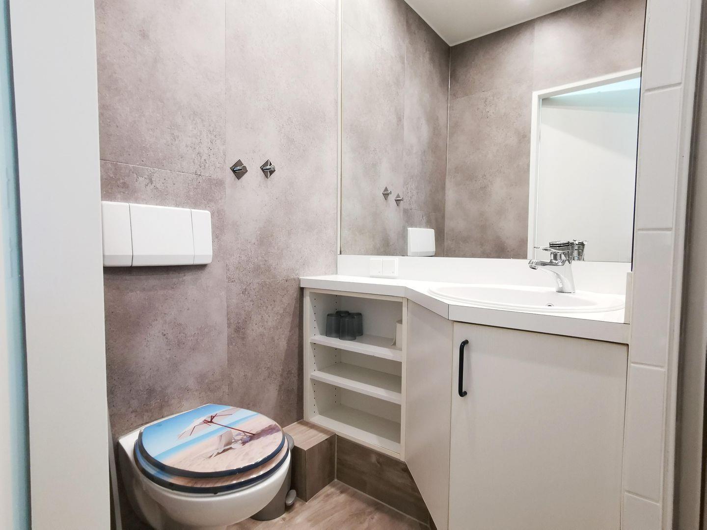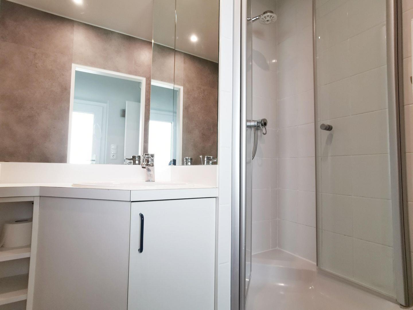Das Bad mit Dusche und WC enthält eine großzügige Ablagefläche über dem Waschbecken und eine schöne Spiegelwand.