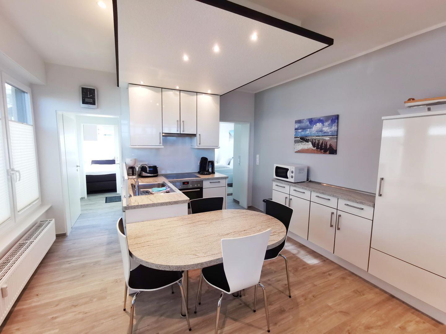 Die Küchenzeile umfasst einen Geschirrspüler, einen Herd mit Cerankochfeldern und einen Backofen.