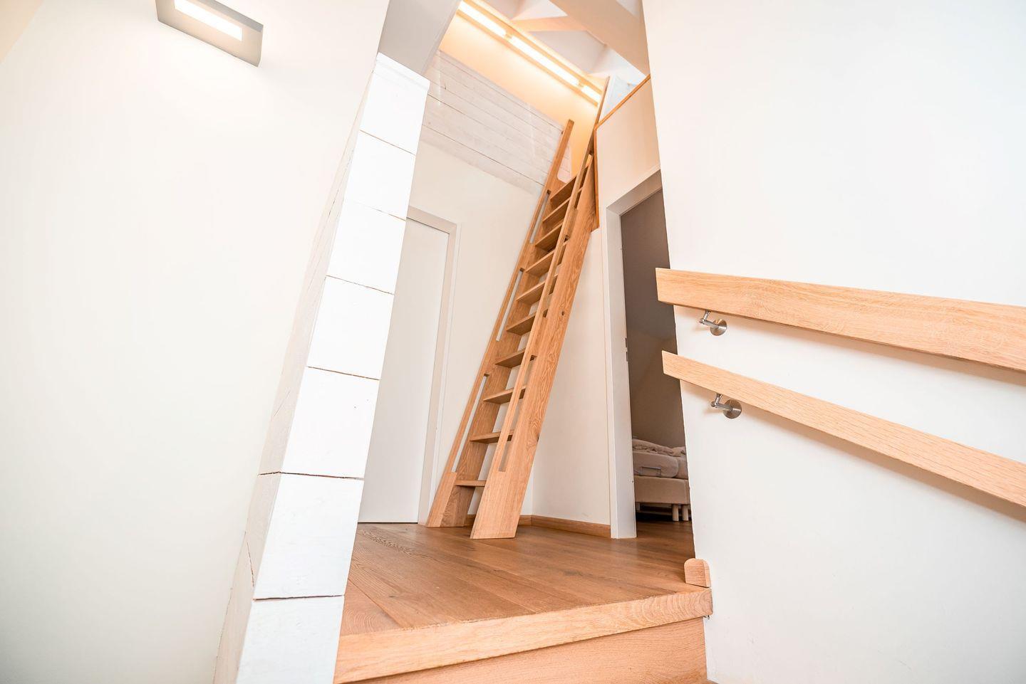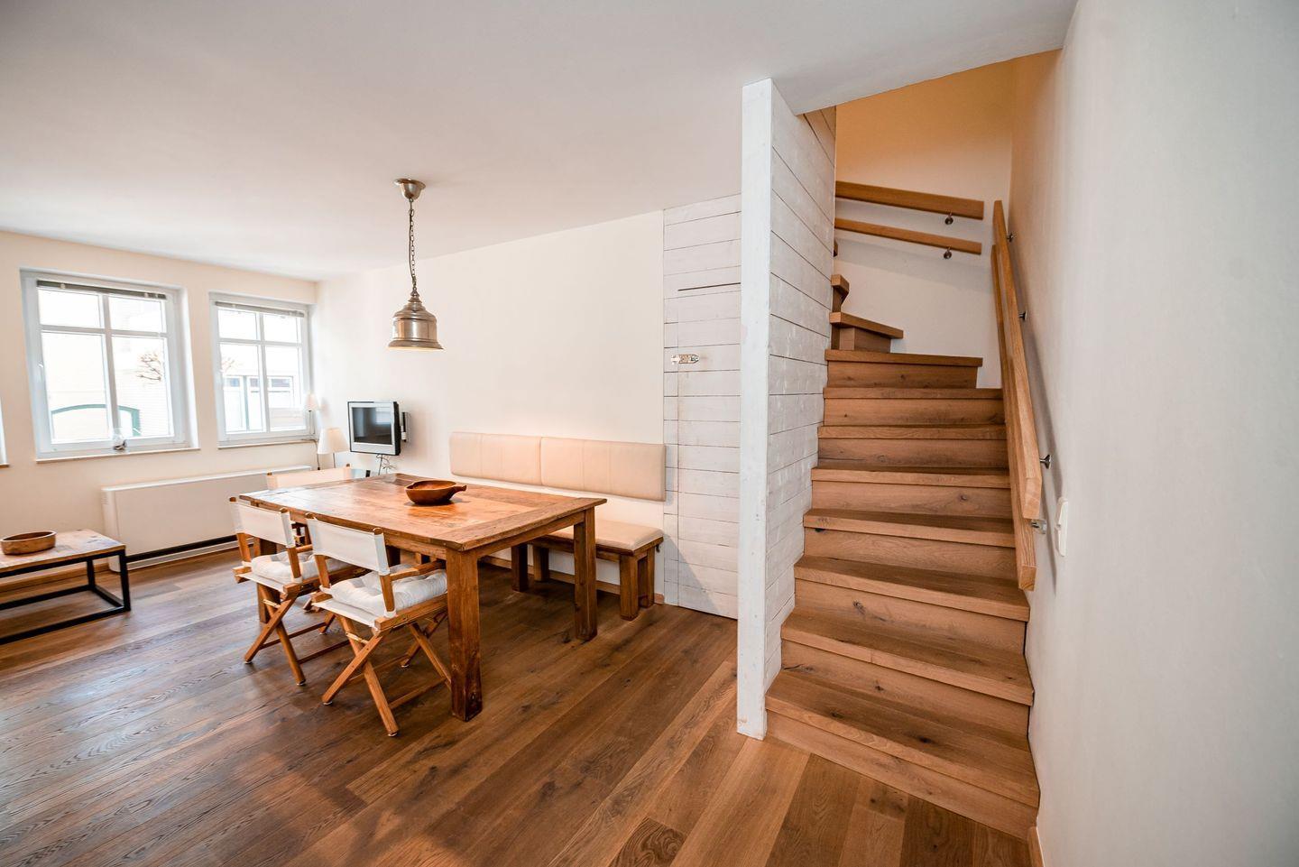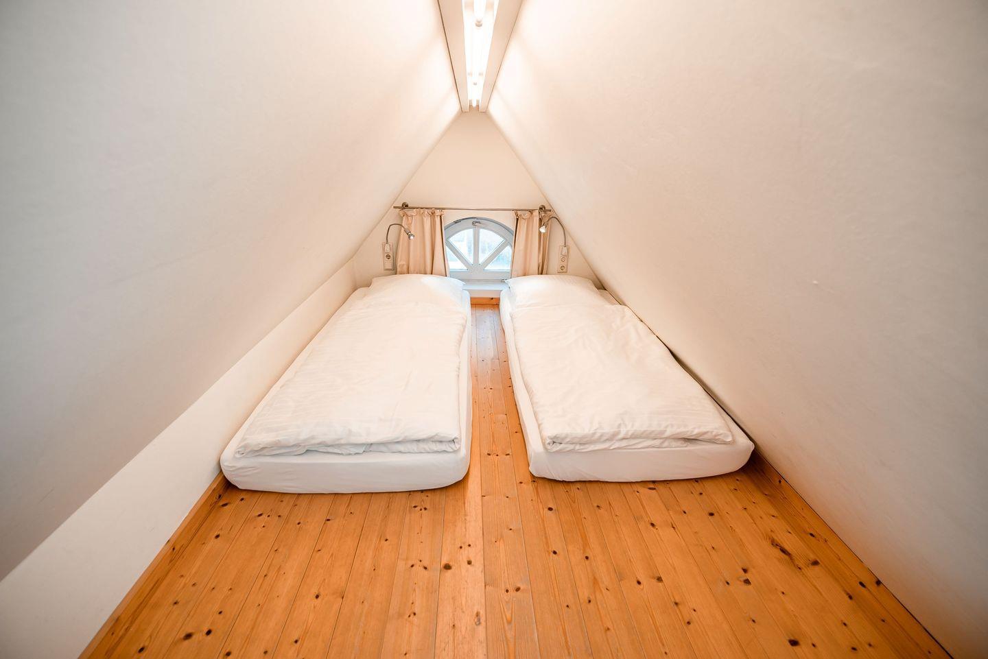 Die Wohnfläche von über 60 qm erstreckt sich über 2 Etagen bis hoch zu einem Lichtband. Im ersten Obergeschoss befindet sich ein Schlafzimmer mit einem Doppelbett. Im Dachgeschoß, wo sich unter dem First eine Schlafempore mit einer lichten Höhe von 1,5 m befindet, finden zwei Personen auf zwei Einzelbetten Platz. Diese ist für Kinder unter 6 Jahre als Schlafgelegenheit ungeeignet, auf Grund der nach oben führenden Leiter.