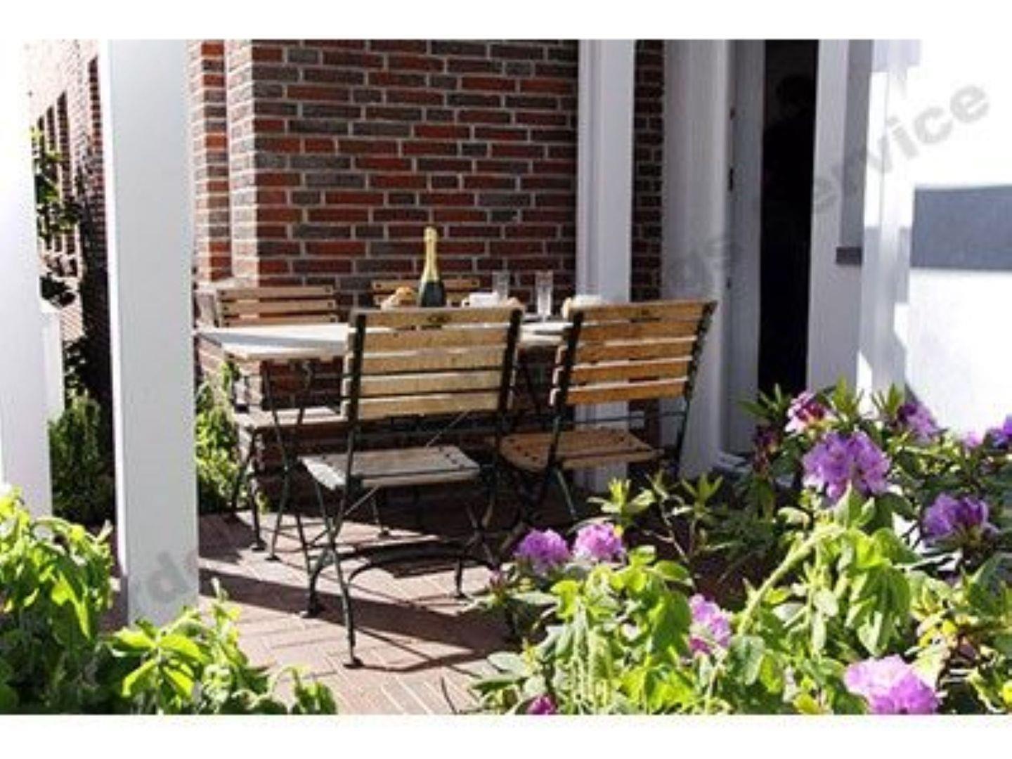 Auf der teilweise überdachten, beleuchteten Terrasse lassen sich an lauen Tagen Frühstück und abendlicher Ausklang genießen.