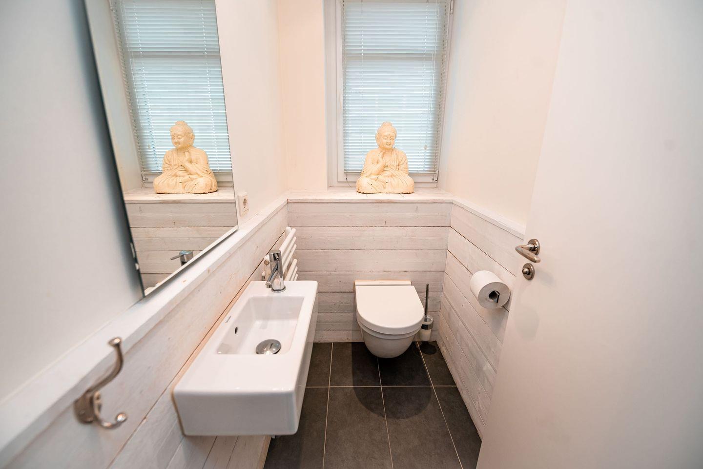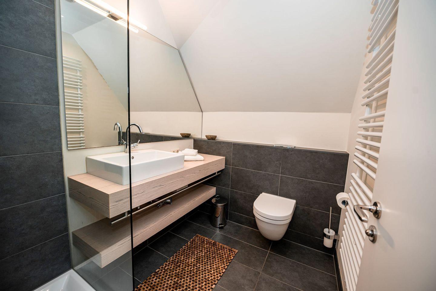 Die weiß getünchte Wandvertäfelung und die grauen großformatigen Fliesen repräsentieren die ganze Eleganz dieser Ferienwohnung.