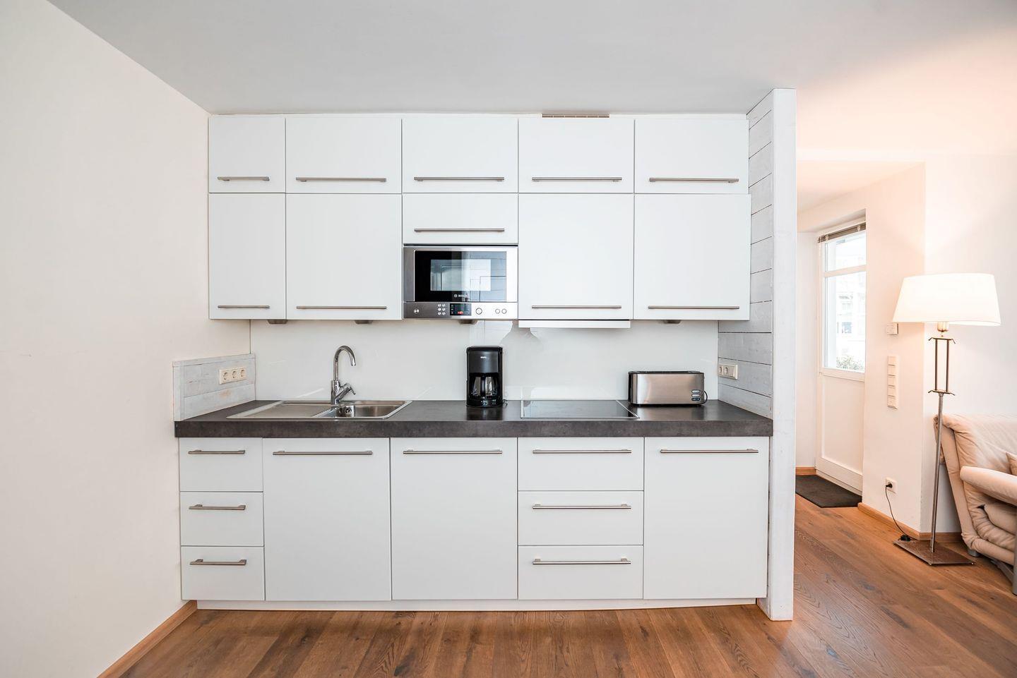 Die moderne weiße Einbauküche mit Bosch-Einbaugeräten (Geschirrspüler, Induktionsherd und Mikrowelle mit Grillfunktion) lässt keine Wünsche offen. Ihre Helligkeit macht das Kochen zu einem eigenen Erlebnis.