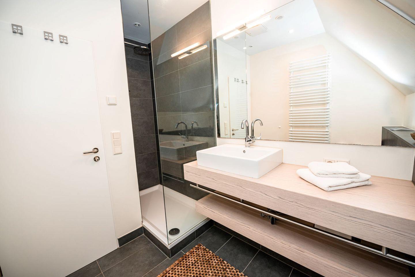 Das asiatisch anmutende Bad verfügt über eine große Duschnische mit Raindance im ersten Obergeschoss.