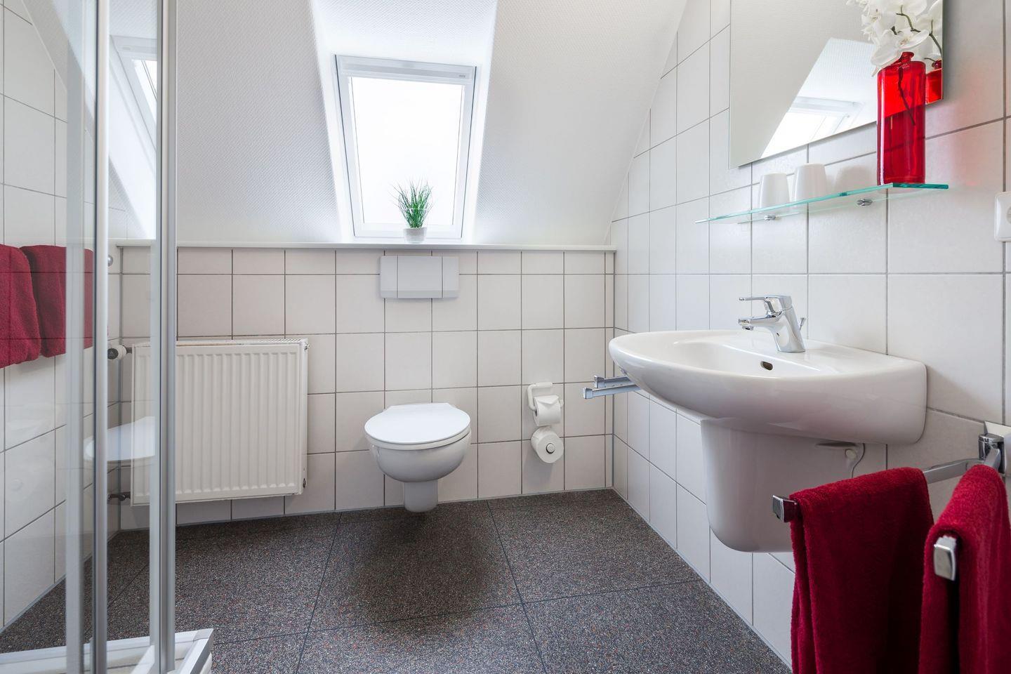 Das Badezimmer ist mit Dusche und WC ausgestattet.