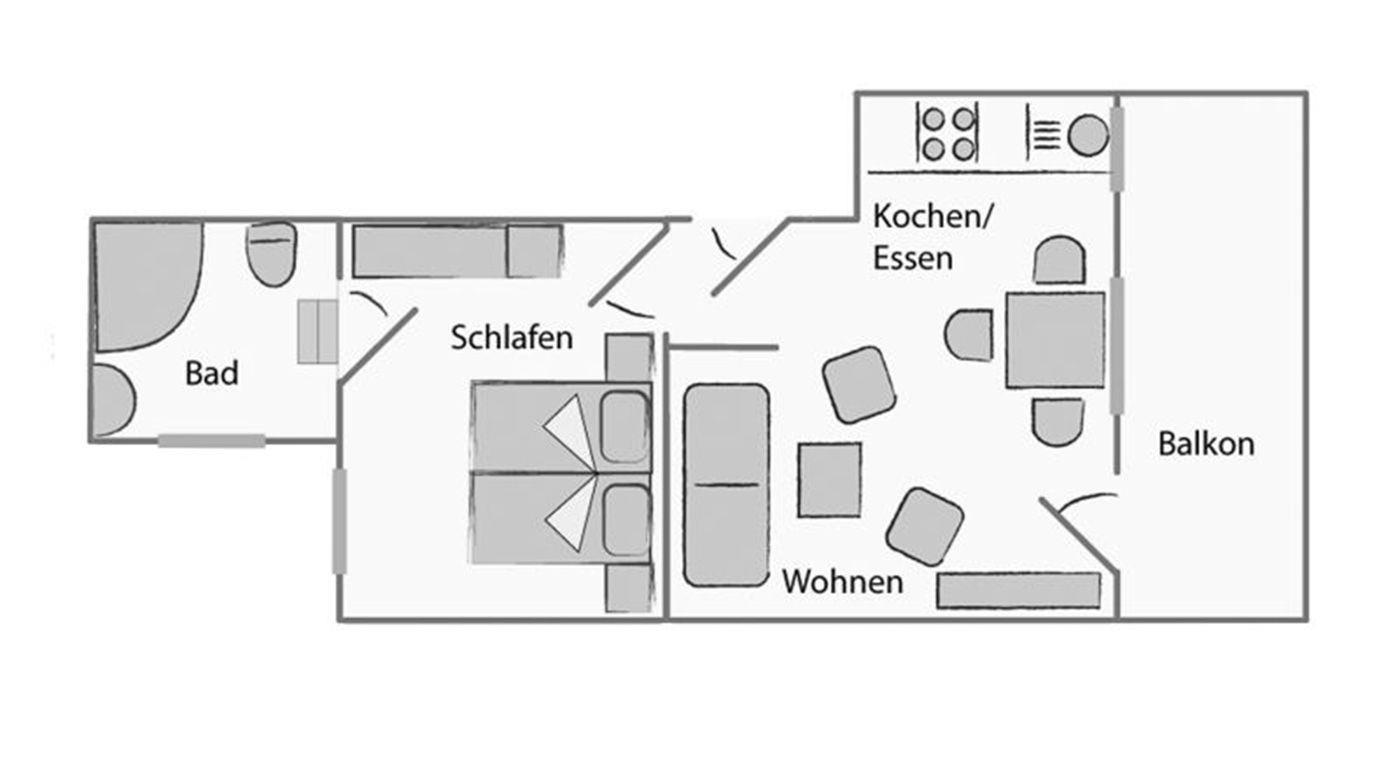Die Wohnung verfügt über ein separates Schlafzimmer mit Doppelbett sowie einen hellen Wohnraum mit Sitzecke und Schlafcouch. Hier ist auch die integrierte Küchenzeile mit Essplatz untergebracht. Das angrenzende Badezimmer mit Dusche, WC, Waschbecken, Fön und Fenster ist über zwei kleine Stufen vom Schlafzimmer aus erreichbar.