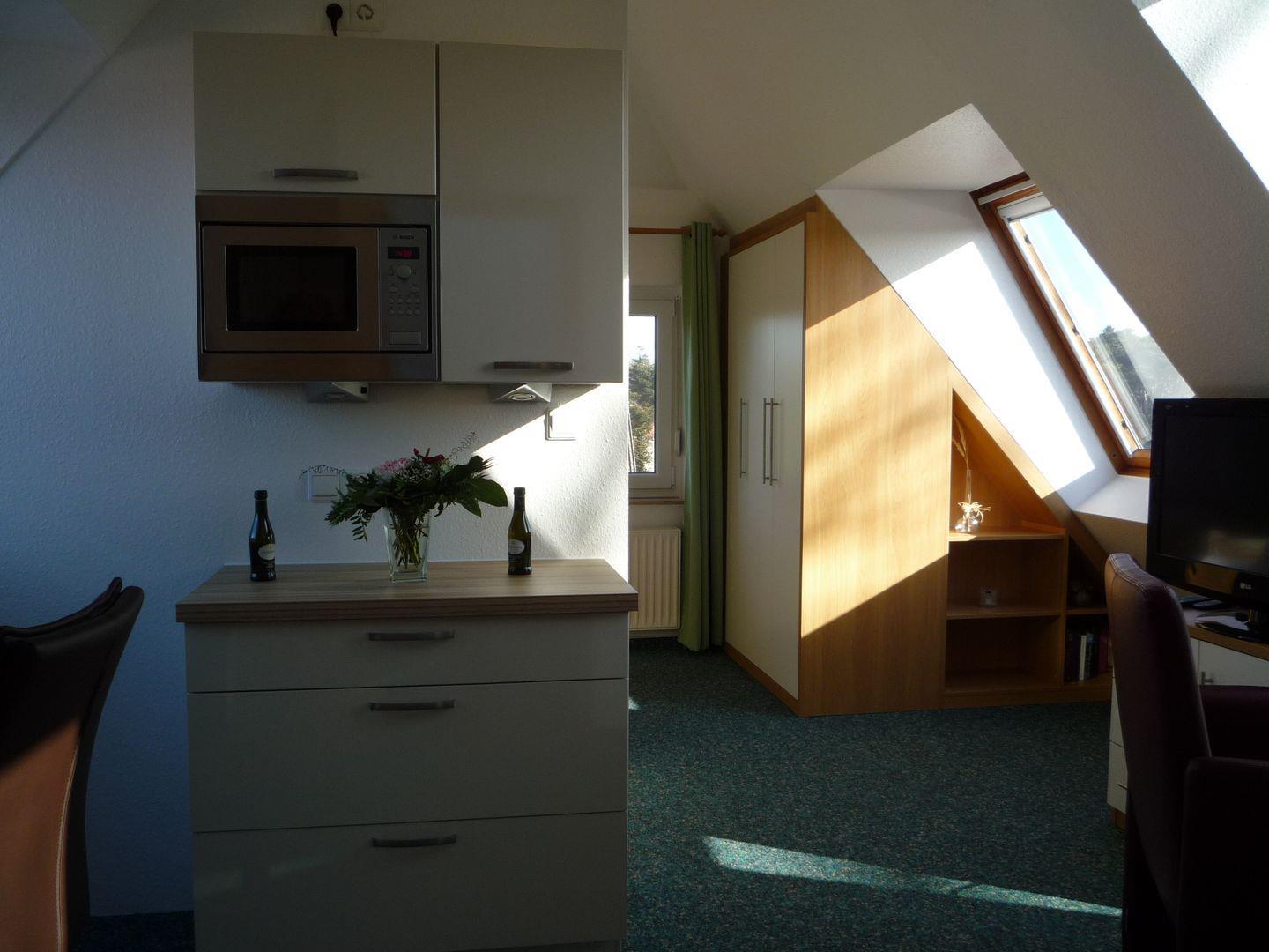 1-Raum-Fewo, Wohn-Schlafbereich mit Doppelbett, Sitzgruppe, kleine Küchenzeile mit 2-Platten-Herd,