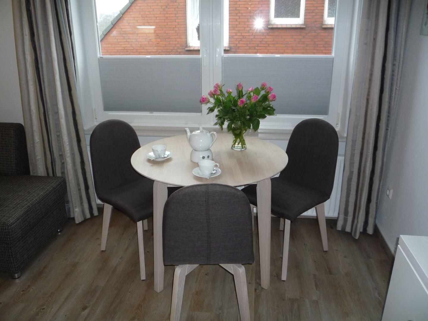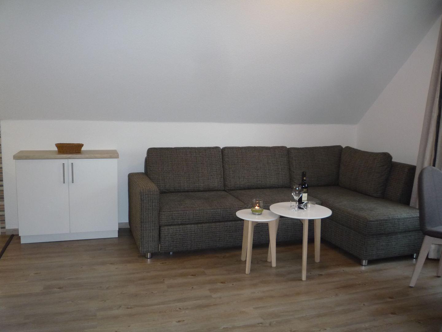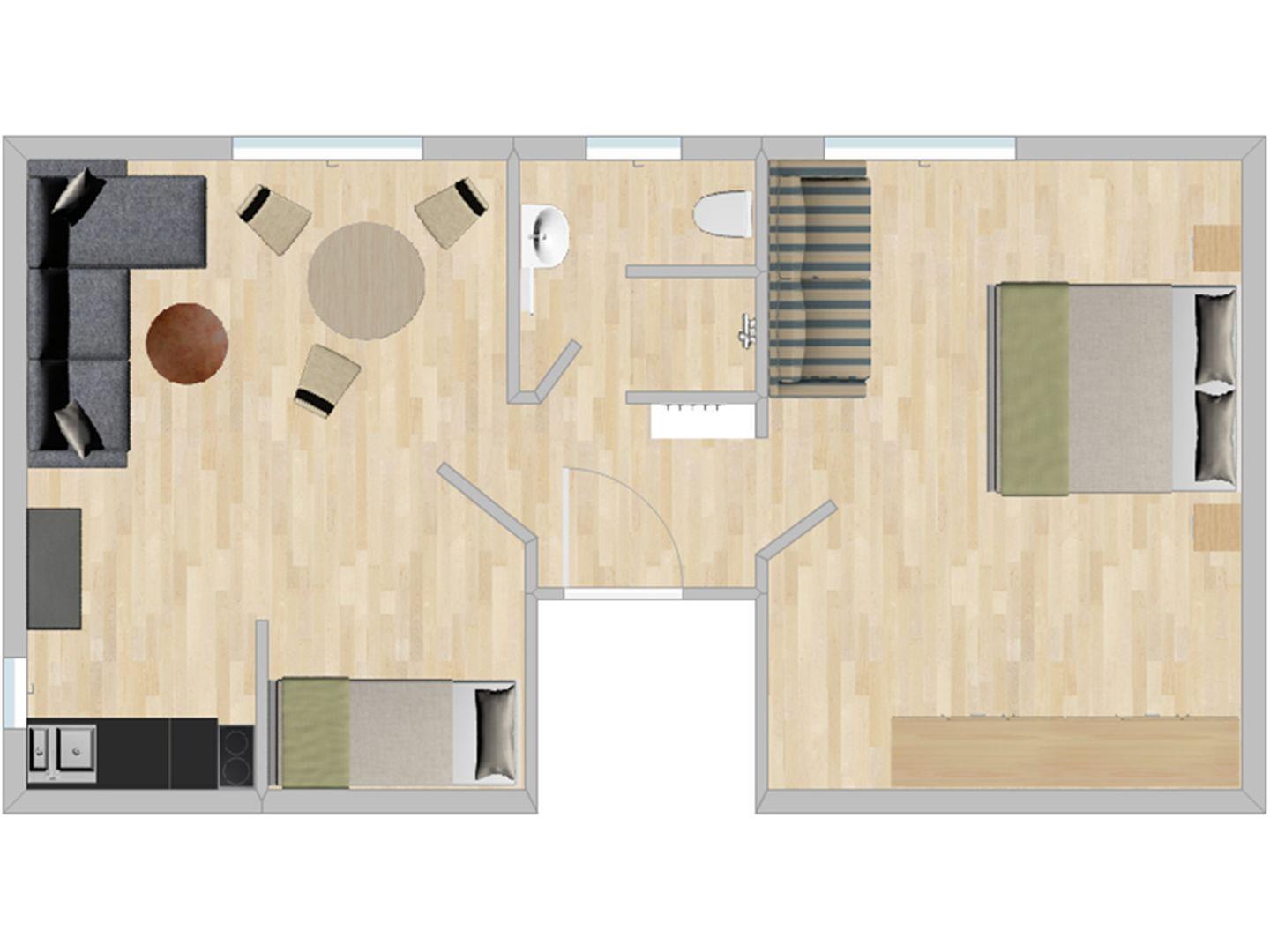 Eine 2-Raum-Ferienwohnung mit teilweise schrägen Wänden, für max. 3 Personen im 1. OG mit ca. 45 m² Wohnfläche.