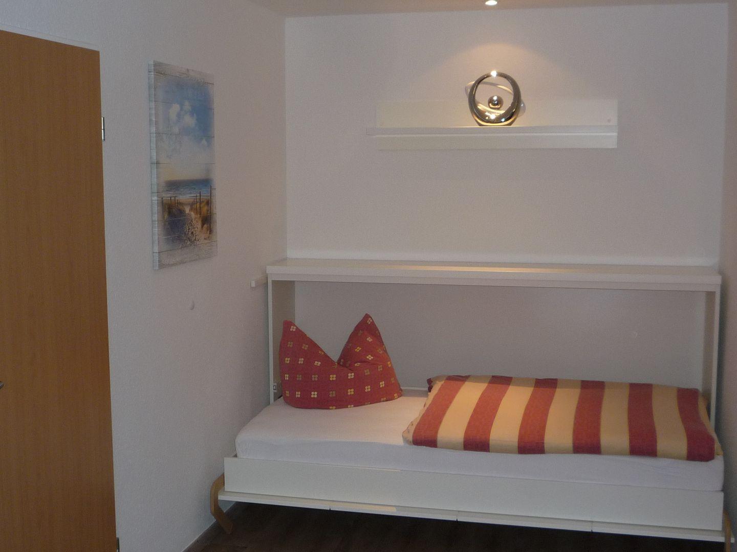 Das Schlafzimmer ist mit einem Doppelbett und einer Schlafcouch ausgestattet. Die Küchenzeile ist in den Wohnraum
