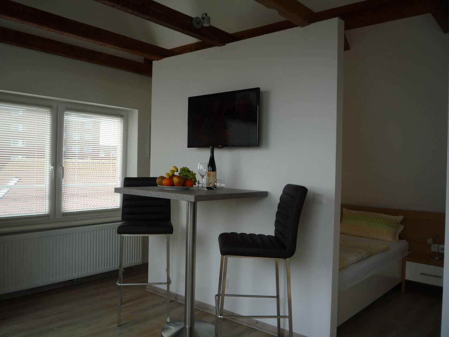 Diese helle 1-Raum-Wohnung mit teilweise schrägen Wänden liegt im Dachgeschoss und hält einen schönen Ausguck für 2 Personen bereit.