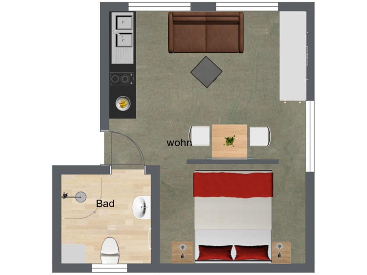 Die Wohnung hat einen Küchen - Essbereich und einen Wohn- Schlafbereich mit einem Doppelbett, Sessel