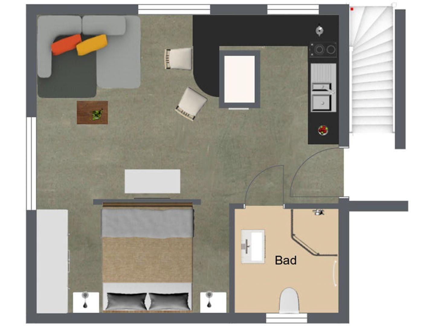 Diese 1-Raum- Wohnung ist aufgeteilt in einen Küchen - Essbereich sowie einen Wohn- Schlafbereich.