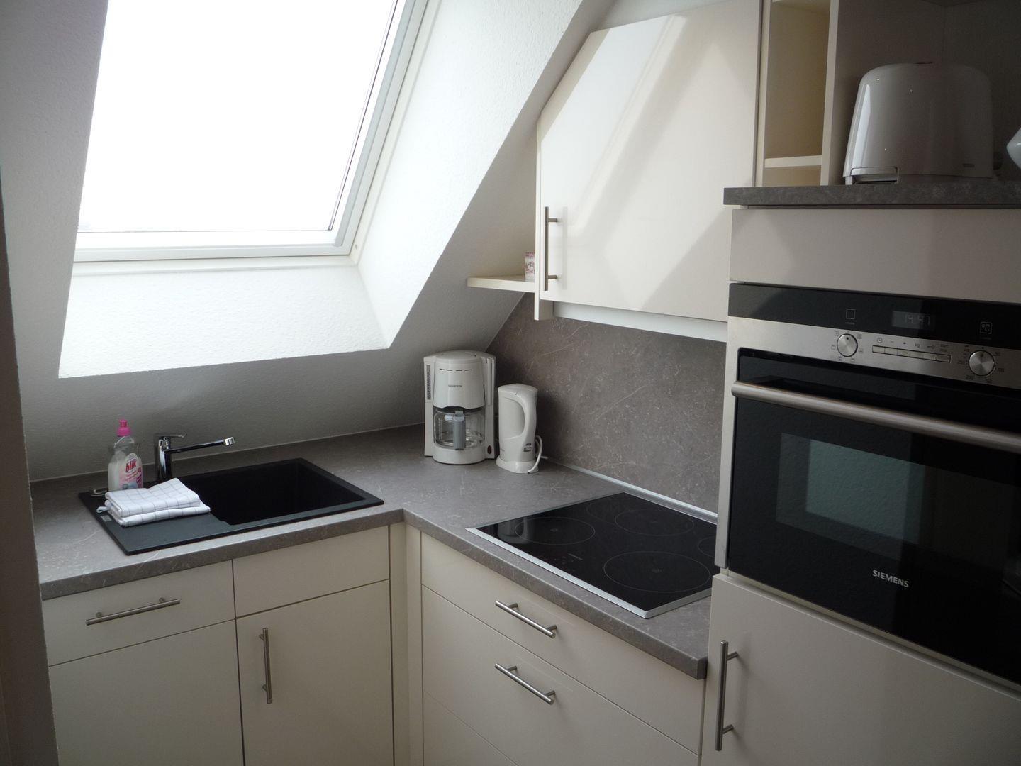 Zur Ausstattung gehört eine Pantryküche mit einem 2-Plattenherd, Mikrowelle mit Grill, Kühlschrank,