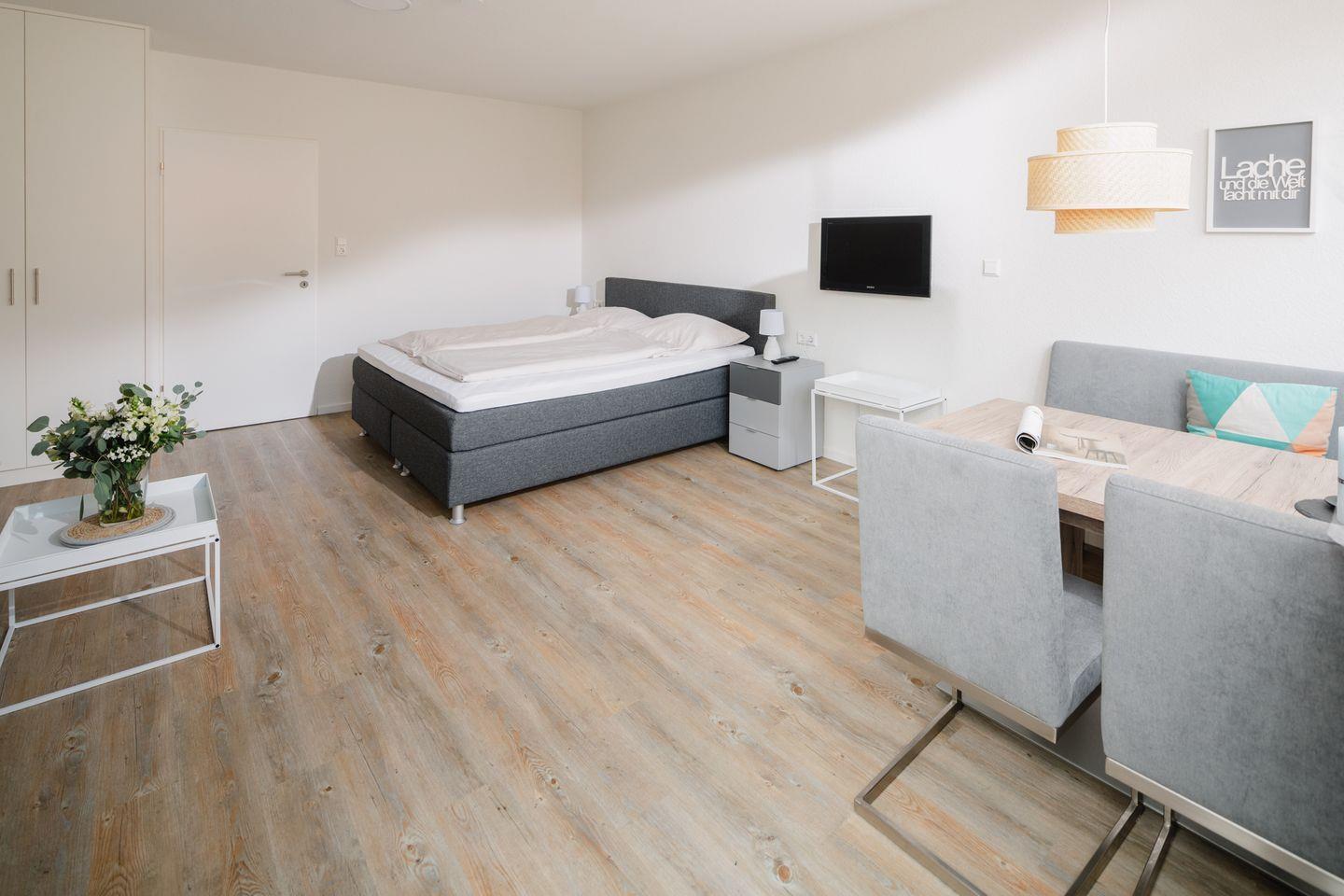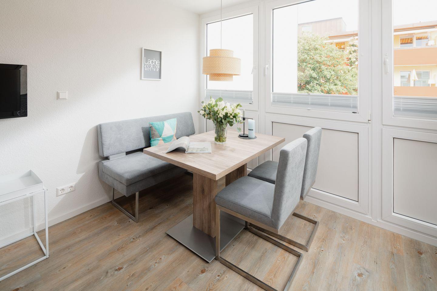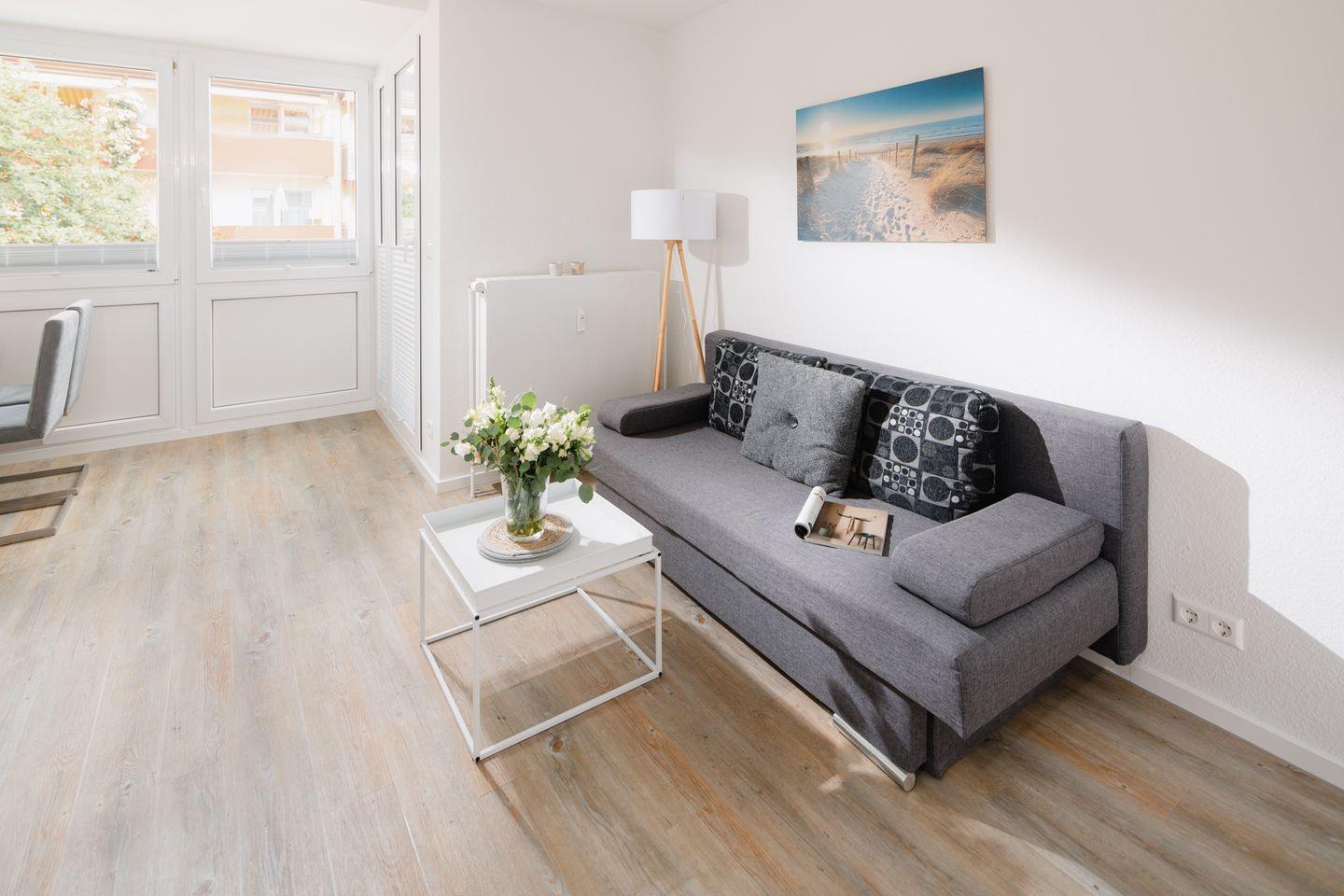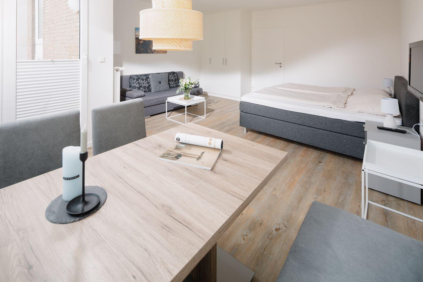 Der Wohnbereich ist geschickt als Schlaf- und Wohnraum gestaltet: Ein gemütliches Boxspringbett und ein Schlafsofa sorgen für bequeme Schlaf- und Sitzmöglichkeiten. Direkt vor dem Fenster lädt ein Essbereich zu gemeinsamen Frühstücken und entspannten Momenten ein. Über den Wohnbereich gelangen Sie auf den Balkon.