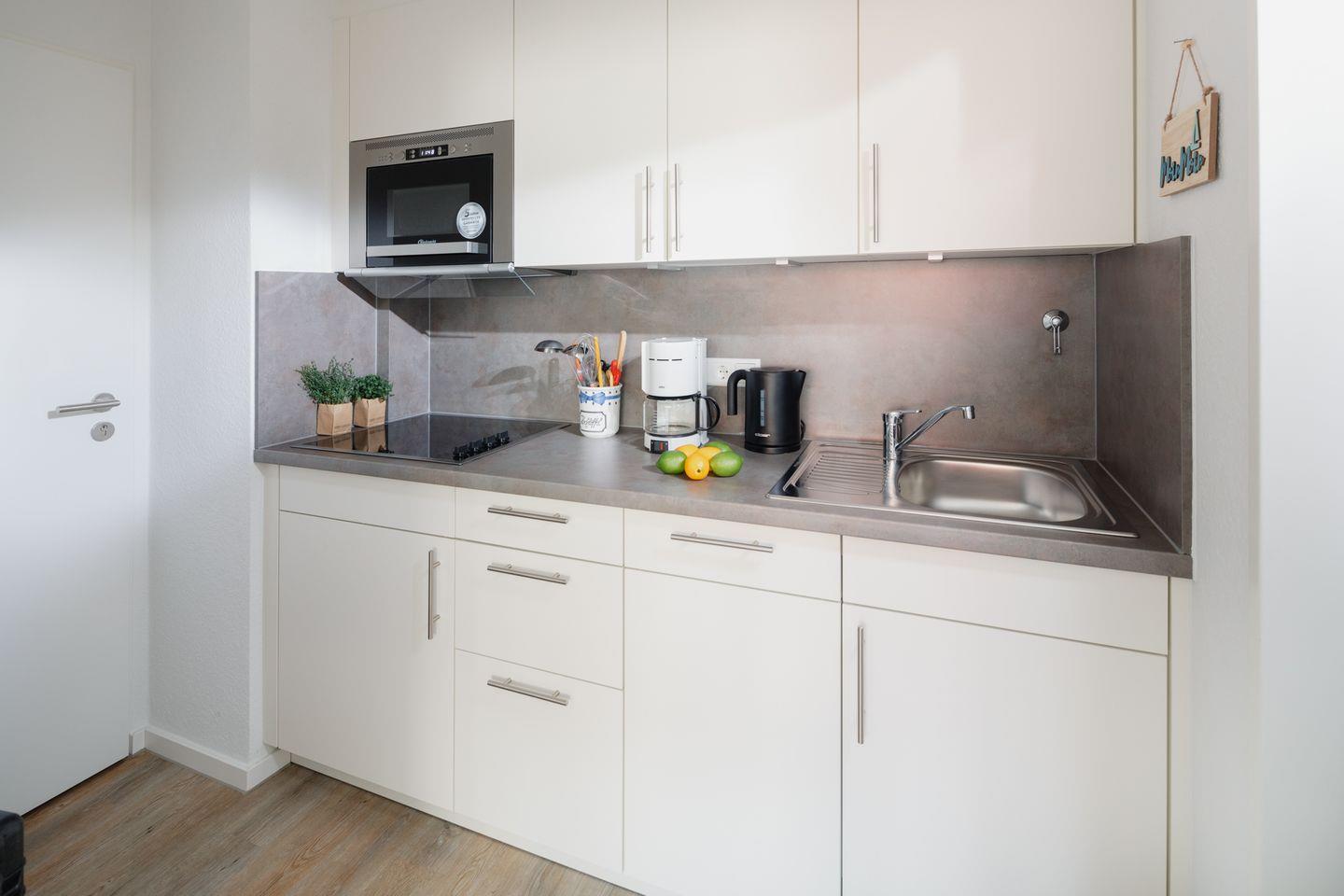 Im Eingangsbereich erwartet Sie eine komplett ausgestattete Küchenzeile, die alle wichtigen Geräte und Utensilien für die Selbstversorgung bereithält.