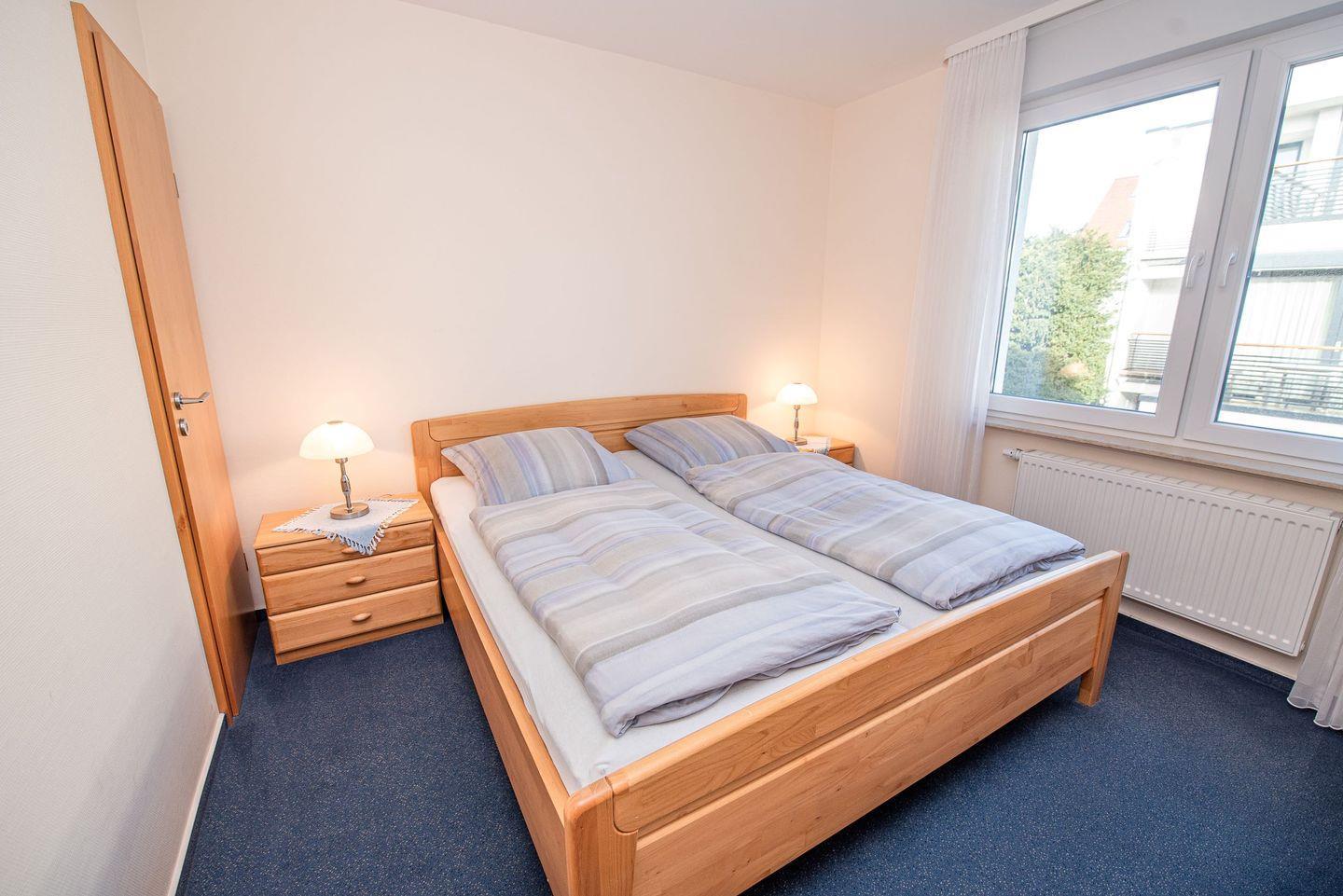 Im separaten Schlafzimmer befinden sich ein Doppelbett sowie ein geräumiger Kleiderschrank. Im Wohnzimmer ist ein Schrankbett für eine zusätzliche Person vorhanden.