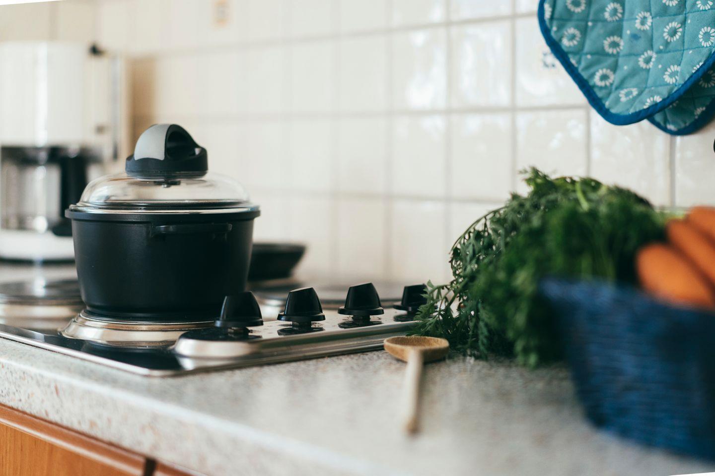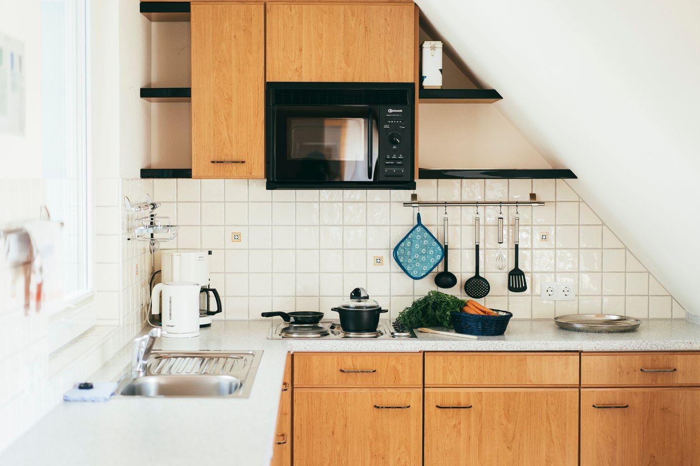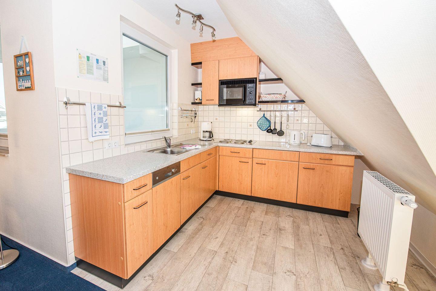 Die Küchenzeile ist mit Geschirrspüler, Mikrowelle, Kühlschrank mit Gefrierfach, 4-Platten Herd, Kaffeemaschine u.v.m. komplett eingerichtet.