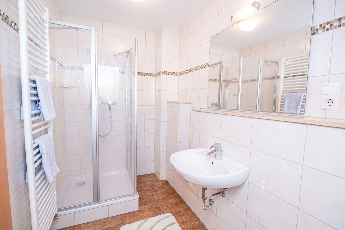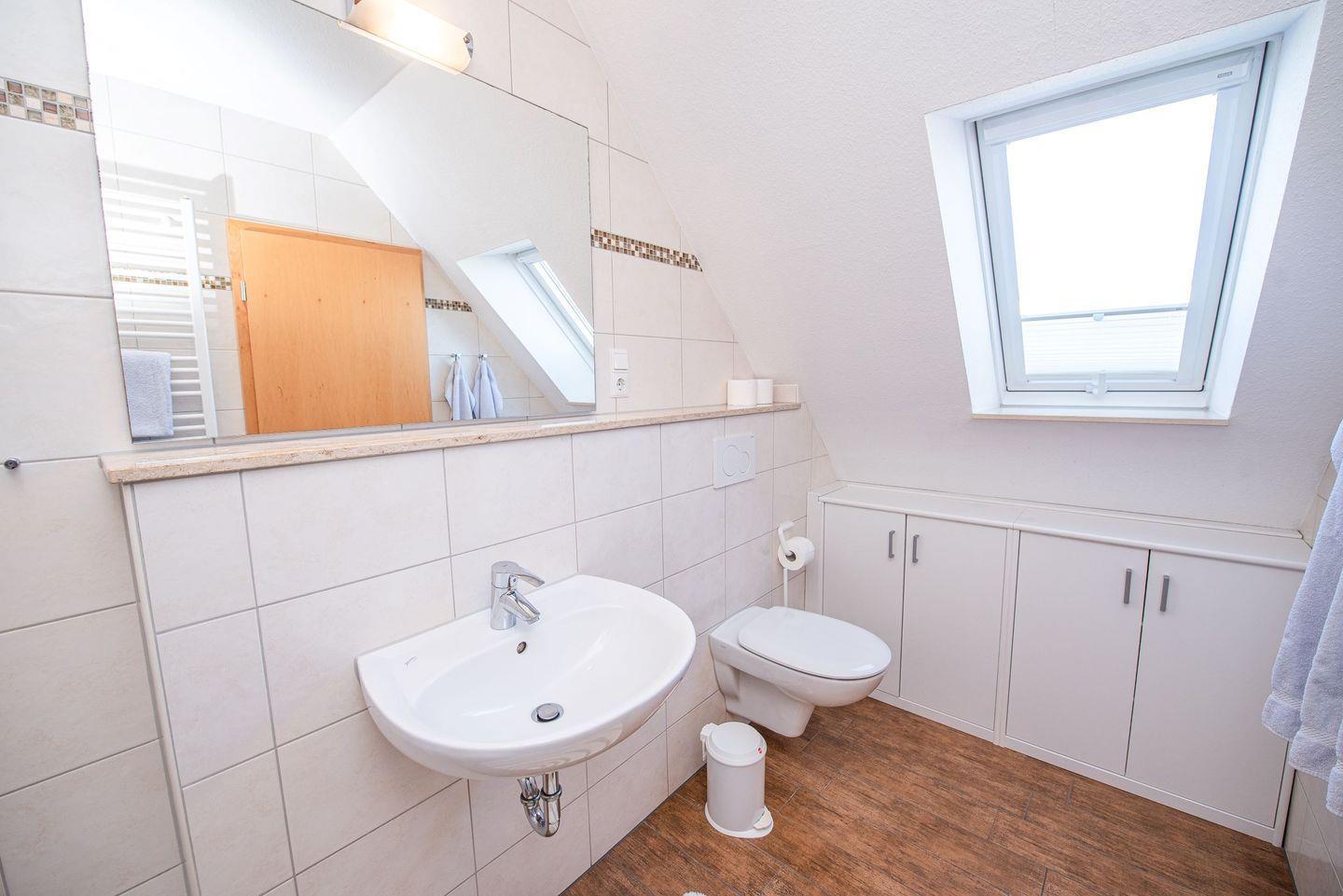 Das Bad mit Fenster ist mit Dusche, Waschbecken, WC und Fön ausgestattet,