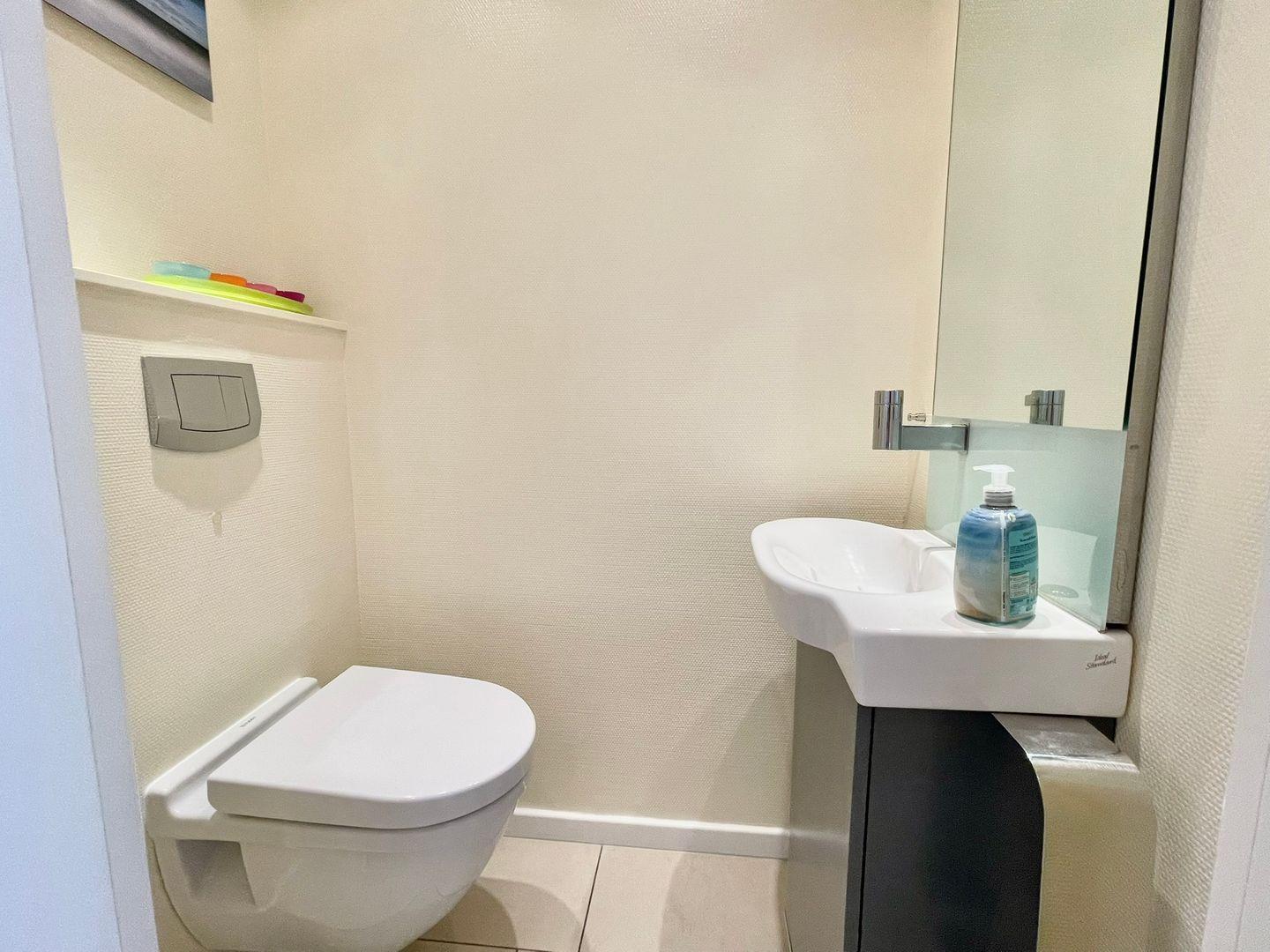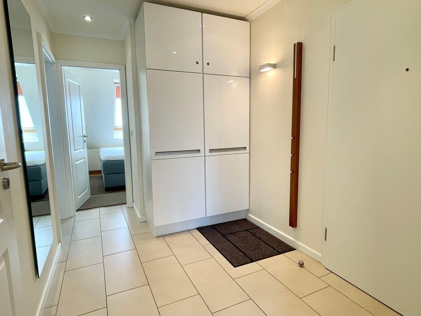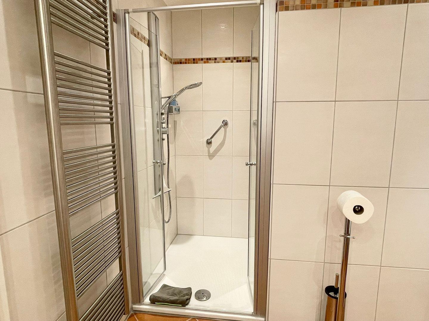 Das geräumige Badezimmer ist modern eingerichtet und bietet Dusche, WC, Bidet, Handtuchheizkörper, Fußbodenheizung und Fön. Zusätzlich steht Ihnen ein separates Gäste-WC zur Verfügung.