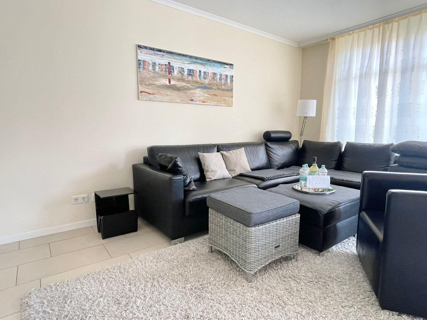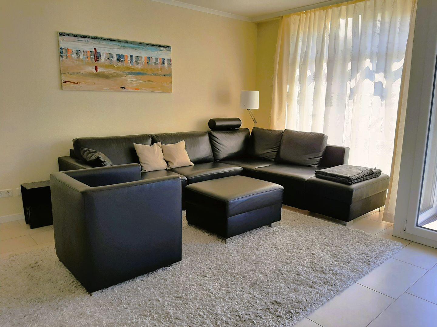 Der großzügige Wohn- und Essbereich ist mit einer komfortablen Sitzlandschaft, einem großen Flachbild-TV und Radio ausgestattet. Die bodentiefe Fensterfront sorgt für viel Licht und ist mit praktischen Sichtschutzstreifengardinen versehen.