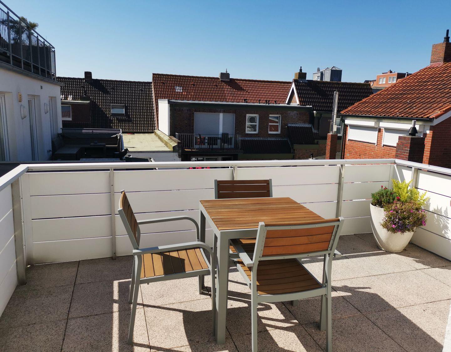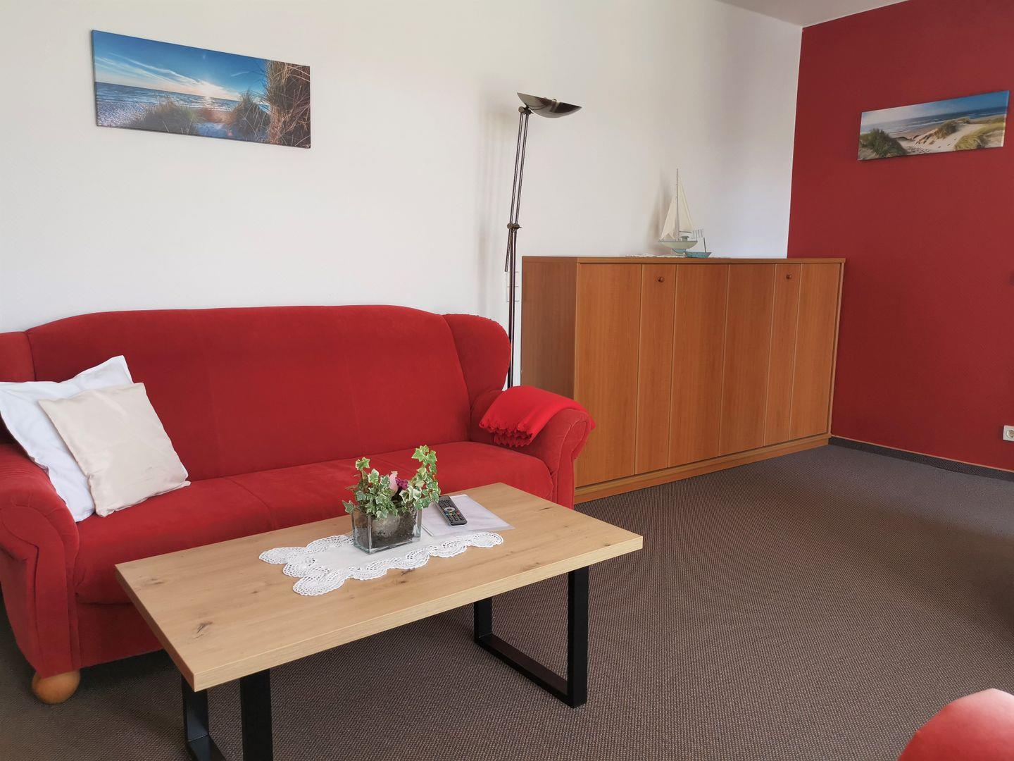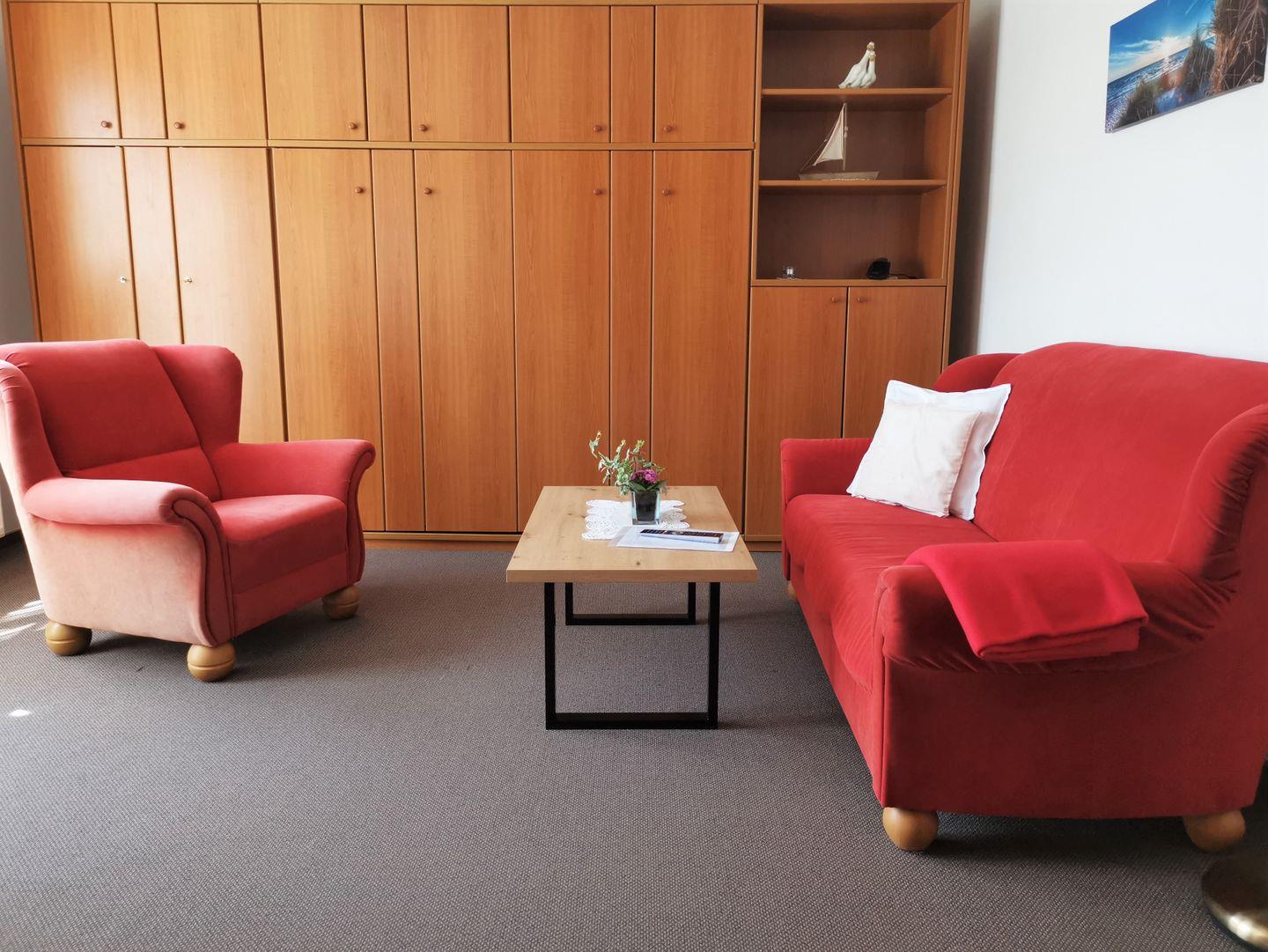 Helle, geräumige Wohnung im 1. Obergeschoss, ca. 44 qm, geeignet für 2 – 3 Personen. Die Wohnung besteht aus einem Wohn-Schlafraum mit Polsterecke und Schrankbetten. Durch das Wohnzimmer haben Sie direkten Zugang zur eigenen Sonnenterrasse.