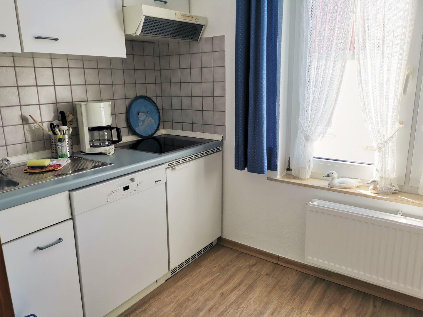 Die Küche ist modern ausgestattet mit Kochplatten, Spülmaschine, Kaffeemaschine, Heißwasserkocher und Toaster.