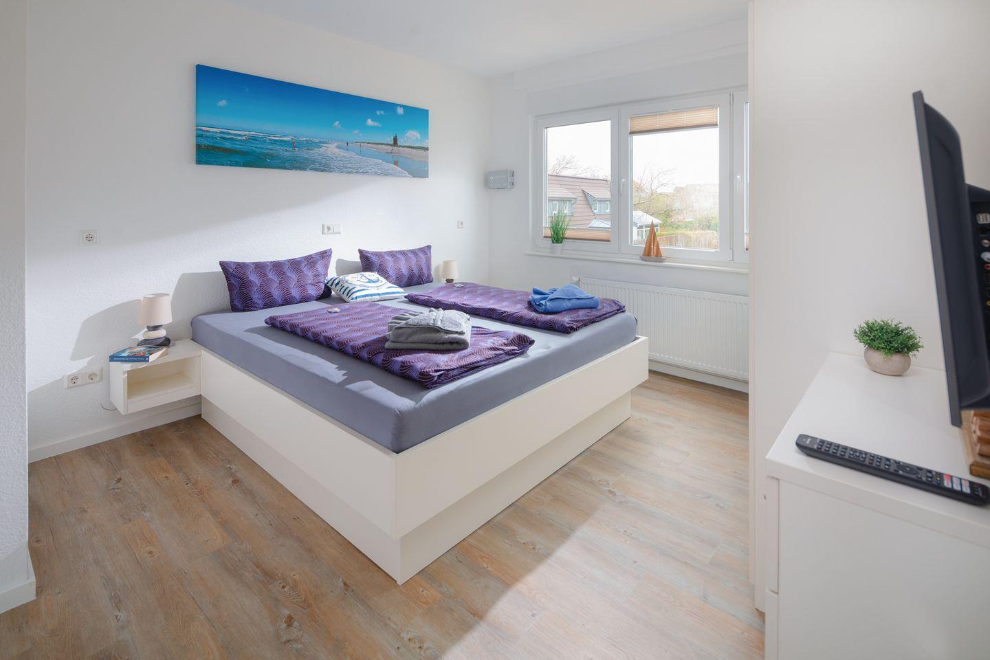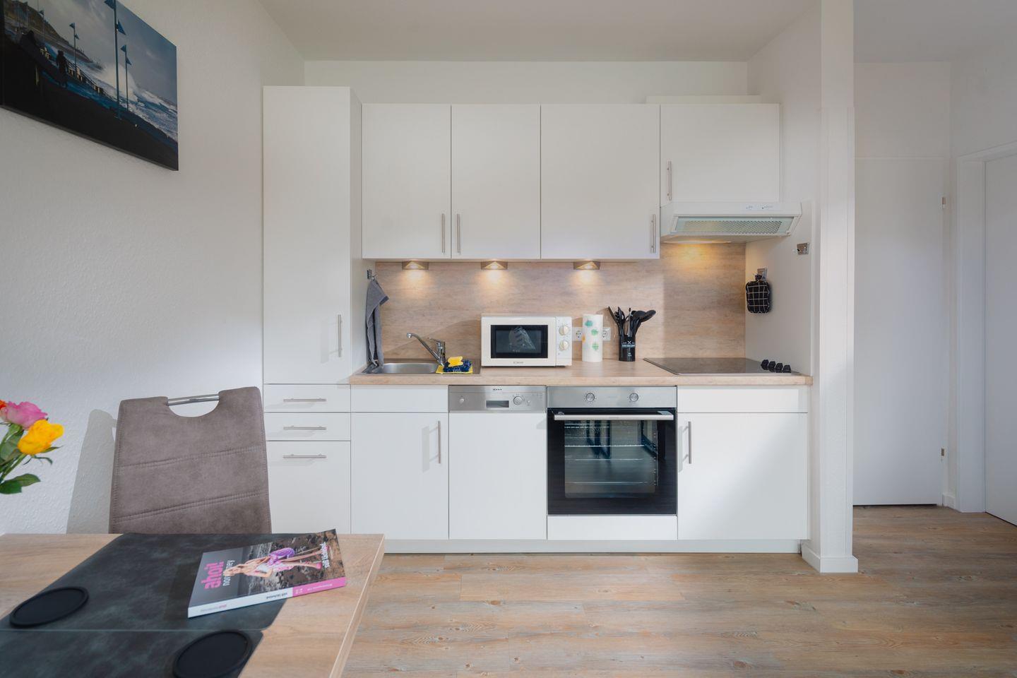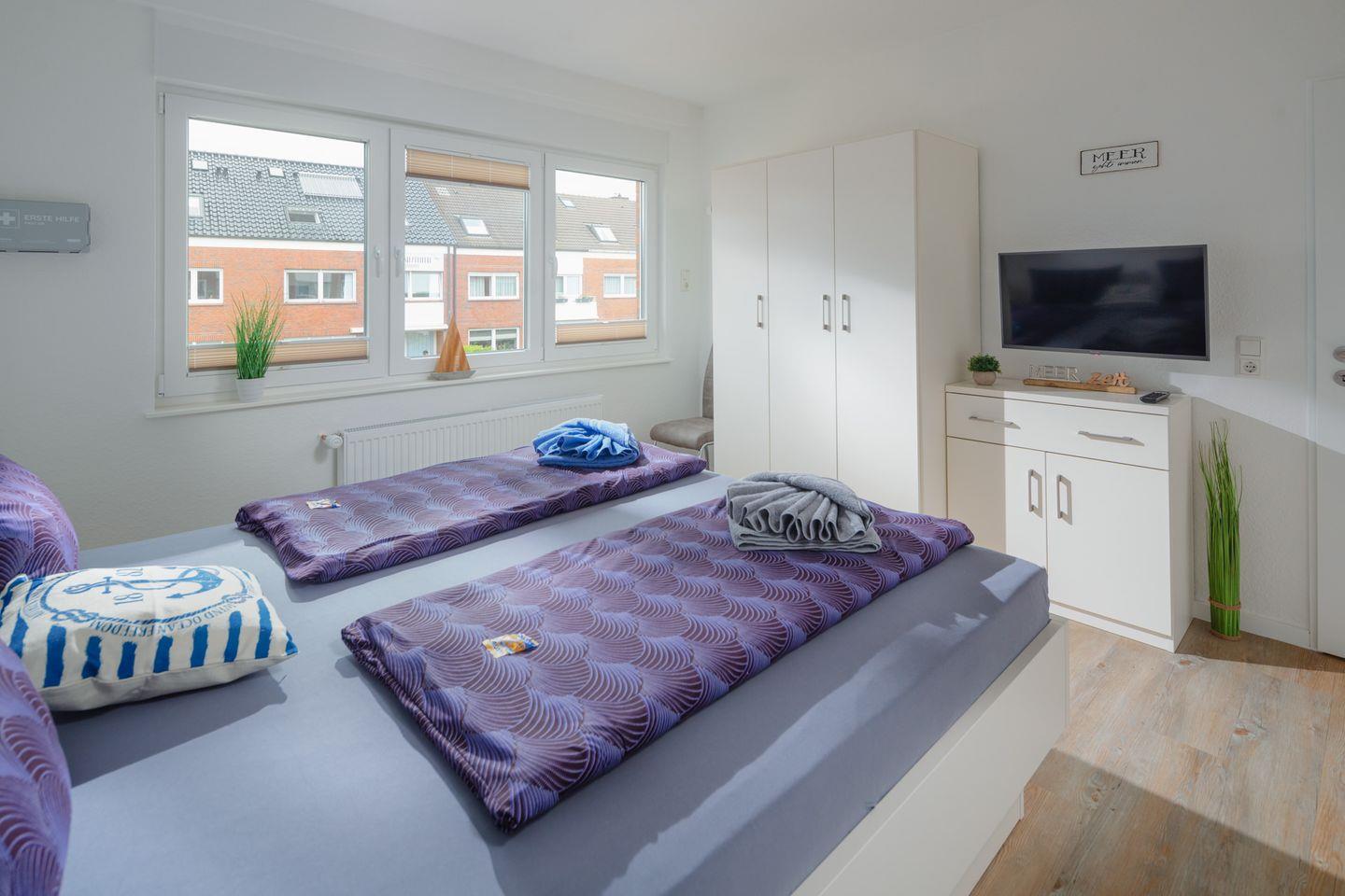 Gemütliche und helle 4-Sterne 2-Raum-Ferienwohnung in ruhiger Sackgassenlage in der 1. Etage. Die Dachgeschosswohnung in einem Reihenendhaus befindet sich zusammen mit zwei weiteren Ferienwohnungen in unmittelbarer Nähe zum Strand und bietet Platz für 1-3 Personen und eventuell noch ein Kinderbett.