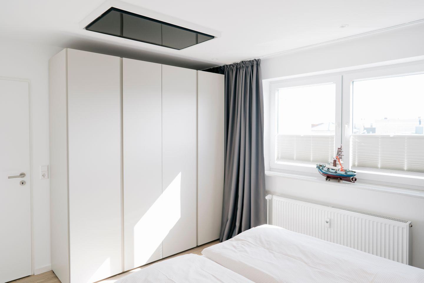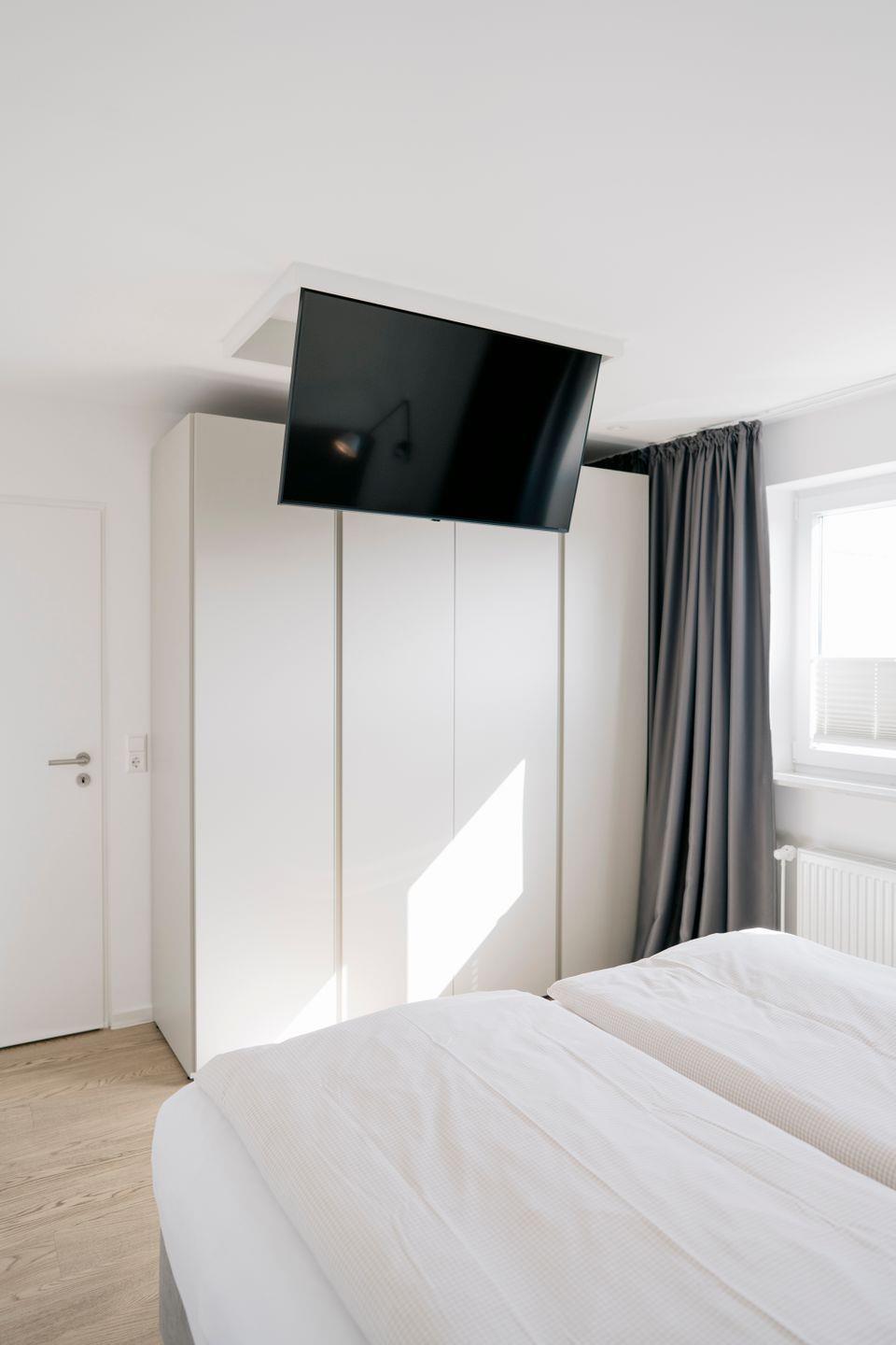 Ein großes Schlafzimmer mit Boxspring-Bett und Kleiderschrank. Ein moderner Flachbildfernseher lässt sich aus der Decke herabfahren.