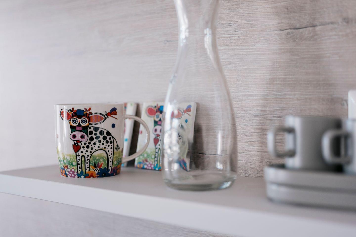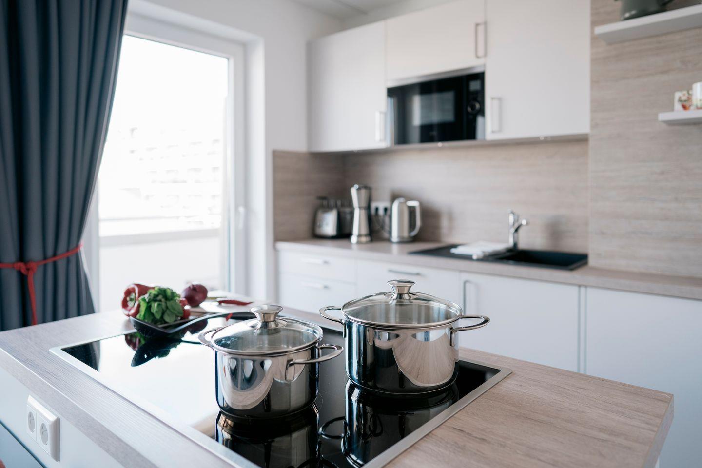 Die gut ausgestattete, moderne Küche bietet einen Kühlschrank, einen Backofen, eine Mikrowelle, eine Spülmaschine und ein Induktionskochfeld. Wasserkocher, zwei Kaffeemaschinen (Filter & Nespresso Kapseln) sowie ein Toaster sind ebenfalls vorhanden.