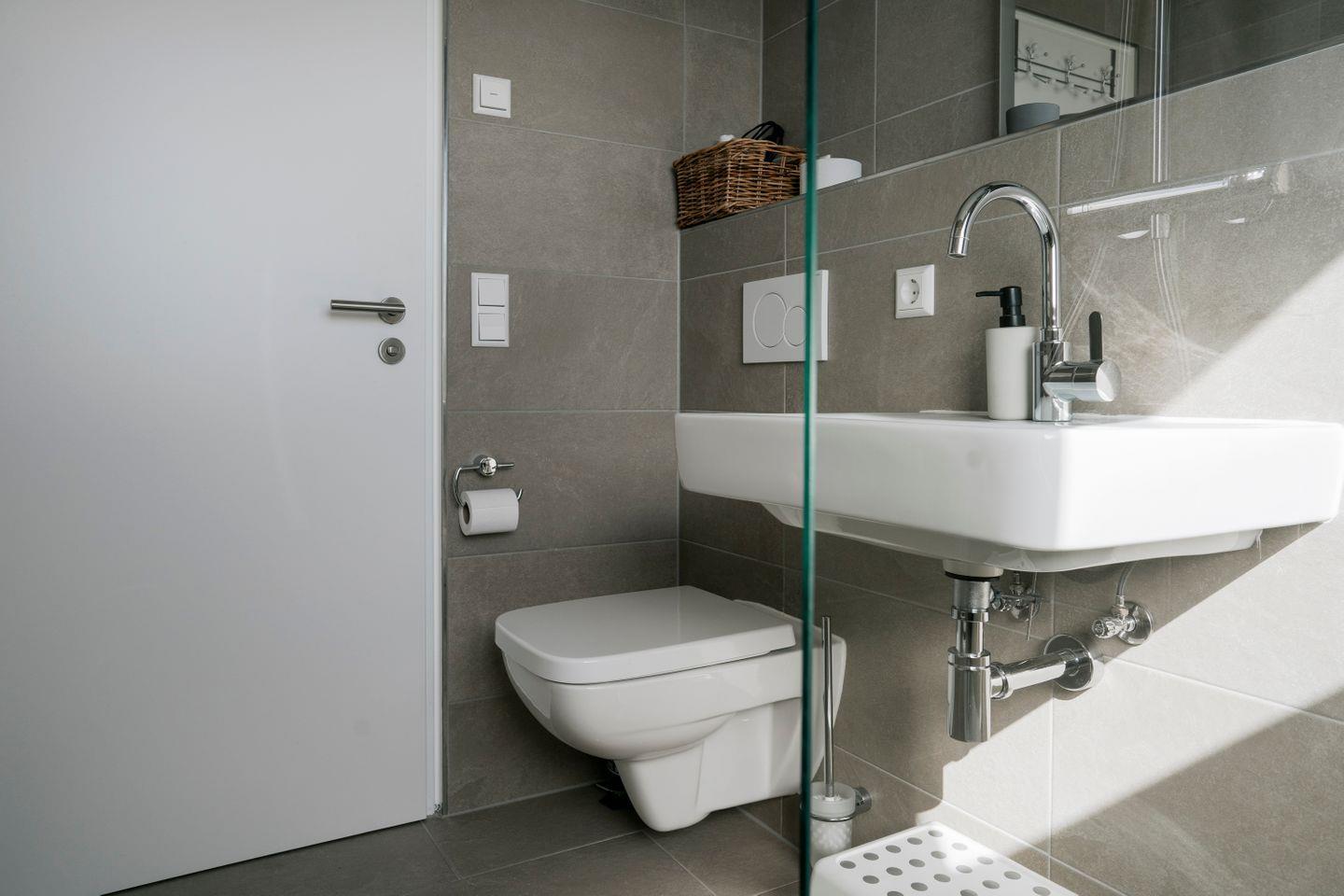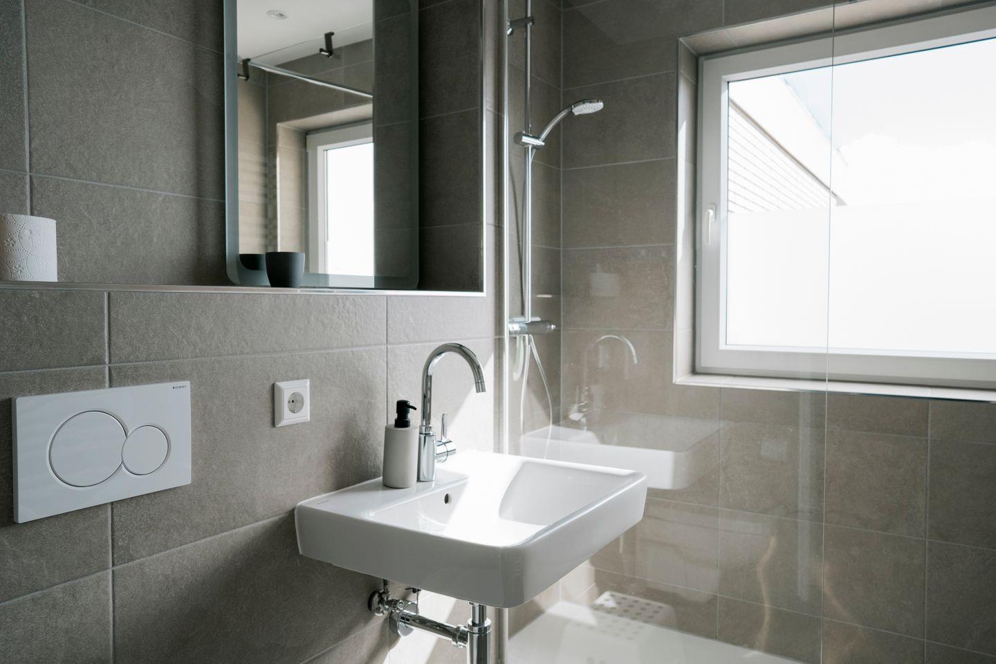 Modernes Bad mit offener und ebenerdiger Raindance-Dusche, WC, Waschtisch und Handtuchheizung. Fenster ist ebenfalls vorhanden.